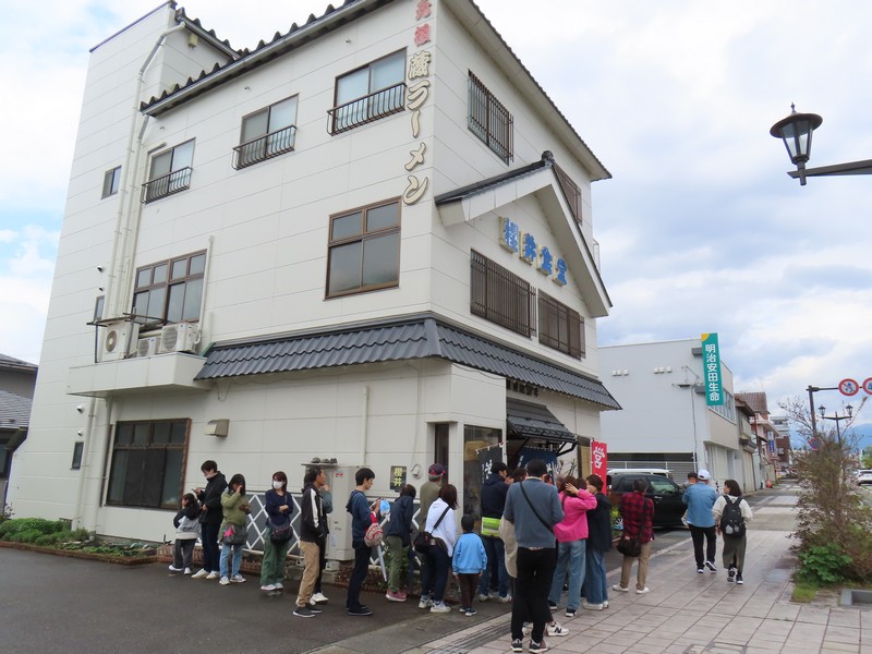 喜多方駅はレンガ造りの門があるきれいな駅。駅前の通りを歩いていく。きれいに整備された街並みだ。駅から5分くらい歩いたところにあるのが目的の店、源来軒。有名なお店だし、にぎわっているようだが待っている人はいない。入ろうとすると、本日営業終了の表示が。要するに売り切れ、ということですね。あらら、ちょっと来るのが遅かったかな。ここからさらに街の方へ行くとお店もいくつかあるのだが、あまり駅から離れると帰りの時間に影響するので、駅方面に戻りますか。確か来る途中に行列ができているお店もあったので行ってみよう。そして駅に近い櫻井食堂に到着。ここはまだ営業しているし、それなりに行列もできているしちょうどいいかな。では並びましょうか。