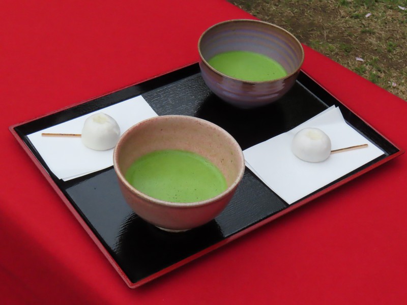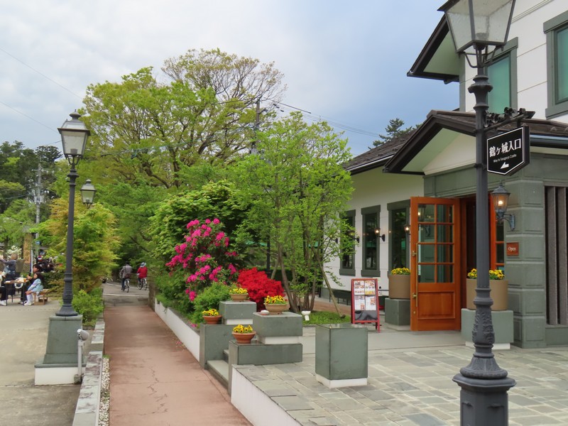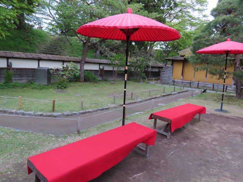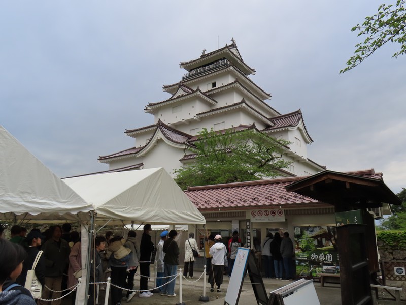 では茶室麟閣へ。蒲生氏郷が利休の子である少庵を匿ったことをルーツとするようで。復元された茶室とその庭園は趣のある造りになっている。ここからの鶴ヶ城を見ると、ちょうど八重桜と一緒に見ることができてとてもきれいだ。さて、せっかくなのでお茶をいただきますか。お菓子が付いてきて、これは山芋と米粉を使ったお饅頭。上品な甘さとほどよくもっちりとした食感の皮がいい感じ。抹茶の苦みとともに、おいしくいただきました。