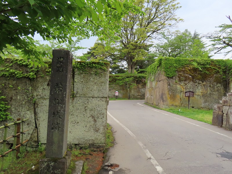 駅前からは「あかべぇ」「ハイカラさん」という2つの周遊バスが出ている。ぐるっと回ってくるが走る方向が逆になるので、鶴ヶ城に行くには「ハイカラさん」に乗るのがちょうどいい。バスにのって10分ほど、鶴ヶ城入口バス停で下車。このあたりはなぜかイングリッシュガーデン風のカフェがあり、その前を通り抜けると「若松城跡」の石碑があり、そのまま進むと広いお堀にでてきた。ここを見るだけでも、大きなお城なんだとわかる。歴代城主の家紋が描かれていて、葦名・伊達・蒲生・上杉・加藤・保科・松平と錚々たる歴史が垣間見える。