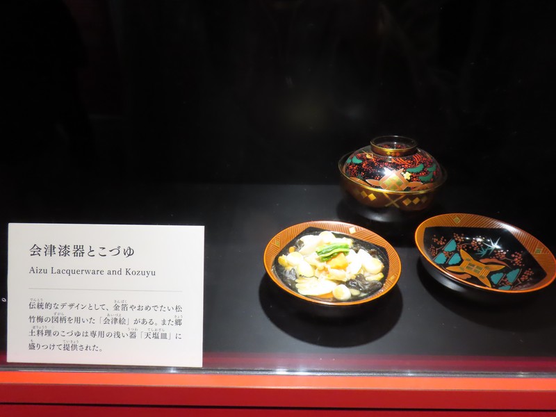 2階には領主の変遷の説明では各領主の時代の領地の範囲が示されていて、今の会津エリアあたりに加えて伊達の頃は仙台方面、上杉の頃は庄内や佐渡方面が領地になっている。なるほどね。その先には会津の歴史に関する展示、やはりここは松平容保、会津藩主にして京都守護職、幕末に京都の治安維持にために新選組を起用した人物。幕末の動乱期に難しい判断を求められることも多かっただろうな。産業についての展示もあり、朝いただいたこづゆをいただくための浅い器「会津漆器」が紹介されていました。