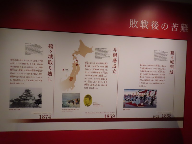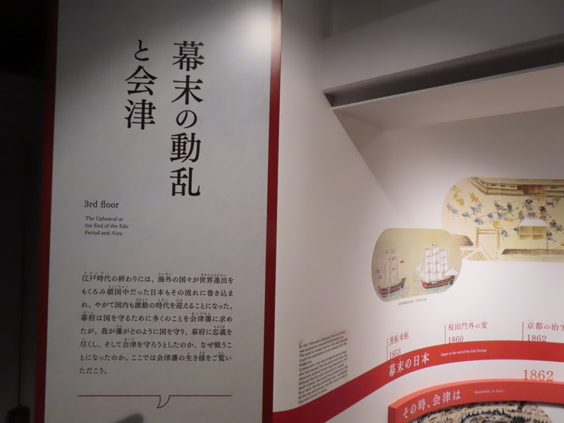 3階は幕末の動乱と会津。黒船来航から大きく動く歴史のうねりの中、翻弄された会津の歴史が時系列に説明されている。新政府軍の突入、鶴ヶ城での籠城、白虎隊の自刃、そして白旗。自分の生まれるわずか100年ほど前に、日本で実際に起きた出来事。当時の状況を今の価値観では推し量ることはできないが、さまざまな葛藤の中での判断だったのだろう。多くの悲劇があるが、やはりその中で最大の悲劇は白虎隊の自刃。もう少し、何かが変われば運命は大きく変わっていたはずだが・・そんなことを思いつつ、展示の中の青少年たちに思いを馳せる。