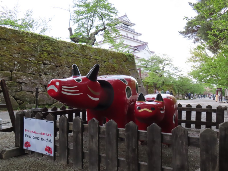 そろそろ17時、まもなくクローズの時間だ。行きますか。天守閣を見上げる広場には白いものがたくさん置かれているが、これはろうそくでも立てるのかな。そんなイベントにタイミングがあえばきれいだろうね。天守閣から下りて一句と、石垣の前には大きな赤べこがいました。お城とともに写真を撮る。帰りは西側から出る方がホテル方面に行くのに便利なので、駐車場に向かって下りていく。この時間は帰る人ばかりなので人の流れについていくと駐車場に到着。よく工事現場でみるかわいい感じのバリケード、カエルやサルなどは見たことがあるがやっぱりここは赤べこなんだ。会津地方限定版かな。これだけでも旅行気分は上がるよね。さらに道沿いに進み、鶴ヶ城エリアを出た。バスの通る道だが20分ほど歩けばホテルのあたりまで戻れるので、ぶらぶら歩きながら行きましょう。ということで、朝に立ち寄った福西本店に到着。では赤べこを買いましょう。ちょうどいい感じの大きさで、微妙に違う表情がいい感じのを選ぶ。これで一つ、買い物の目的を達成しました。あとはジャムやえごま入りマスタードなども買いました