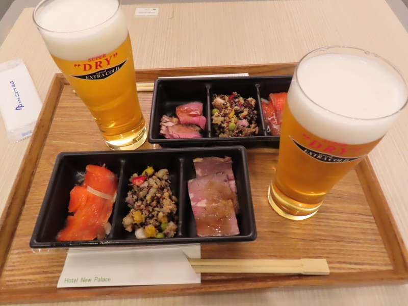 ホテルへと戻る。朝ごはんを食べたところで夜も食事ができるのだが、今回の宿泊プランは生ビール&おつまみ付きプラン。それはいただかないと。今日のおつまみはマリネサーモン・ローストビーフ・キヌアとワイルドライスのサラダ。どれも好みで、それに冷たい生ビール。最高だ。今は20時、ここは21時までなので、早めに居酒屋さんに行って馬刺しを味わえてよかったな。そしてホテルでこのおつまみを結ったい楽しむ、いいプランだね。