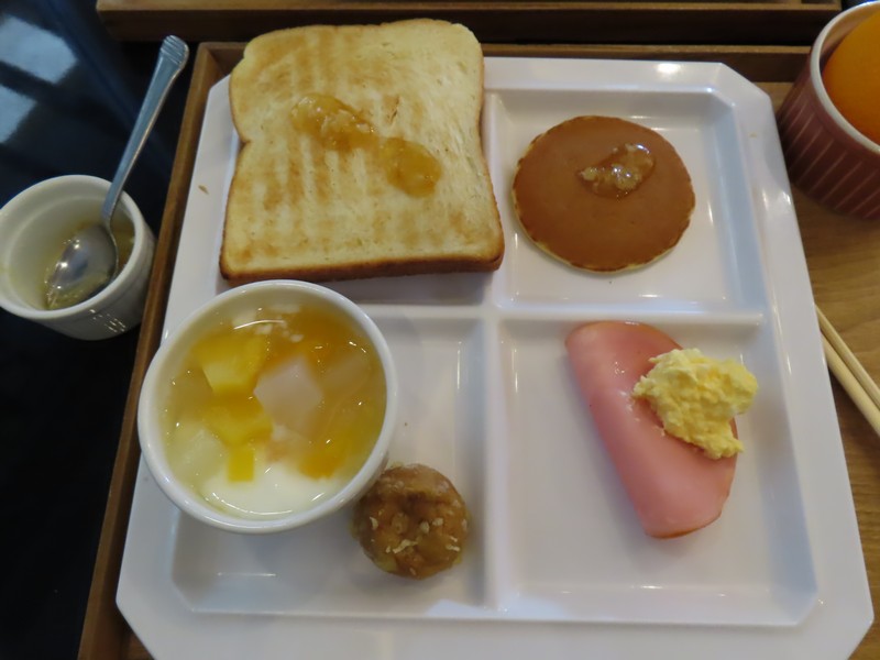 7時半過ぎ、朝ごはんへ。今日も生しぼりジュースをいただき、おかずをたっぷり食べる。こづゆも忘れずに。パンケーキには会津産のはちみつを合わせ、あとはまんじゅうの天ぷら。大内宿でも食べたが、衣の薄いタイプがおいしいかな。しっかり食べて、ごちそうさまでした。部屋に戻って用意して、9時ごろチェックアウト。荷物は預かっていただきます。