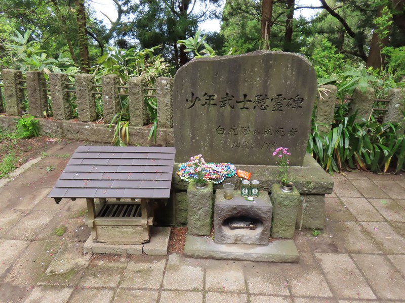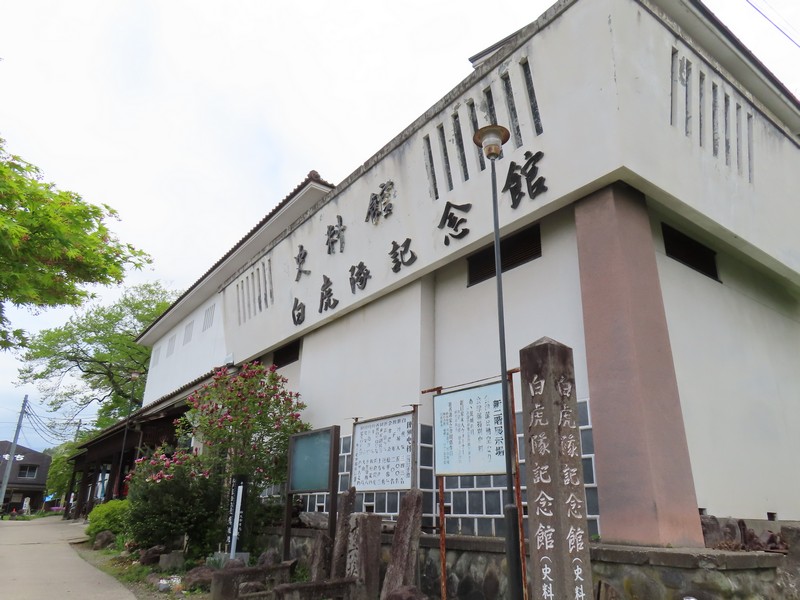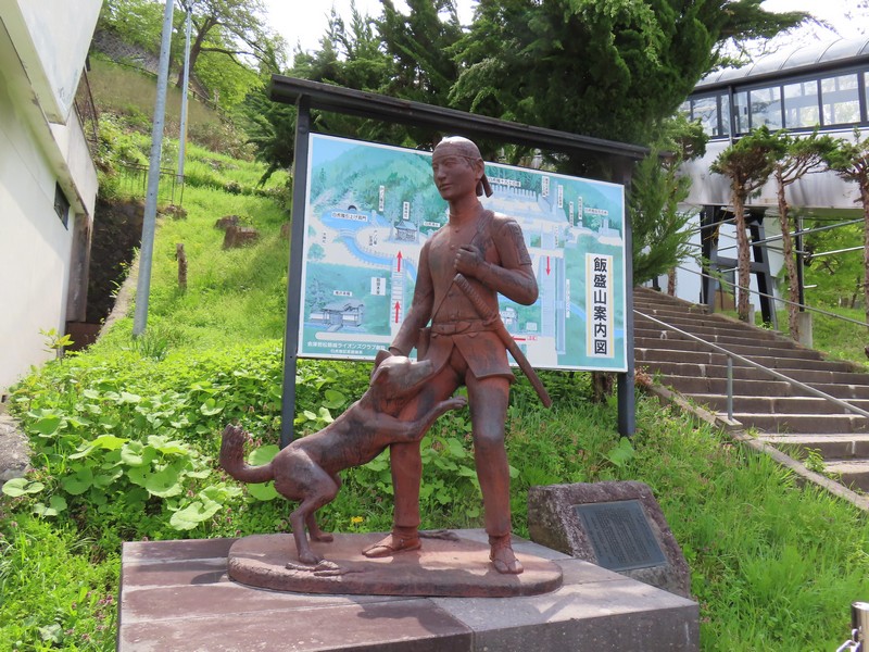 車窓で観光しつつ、飯盛山下バス停に到着。ここから階段かスロープコンベアを上がってもいいのだが、他にも見る場所があるのでそちらから登ろう。階段の手前には銅像があり、これは白虎隊士酒井峰治と愛犬クマのもの。自刃した白虎隊士とは別行動をとっていたが道に迷い、その時に愛犬により救われたというもの。いろんなドラマがあるんだな。その隣にある白虎隊記念館、ここはあとで来ましょう。