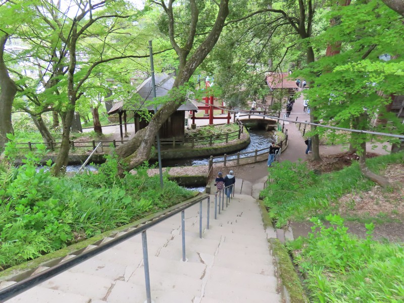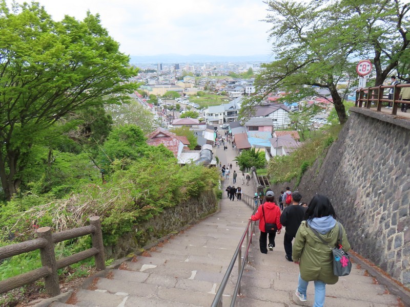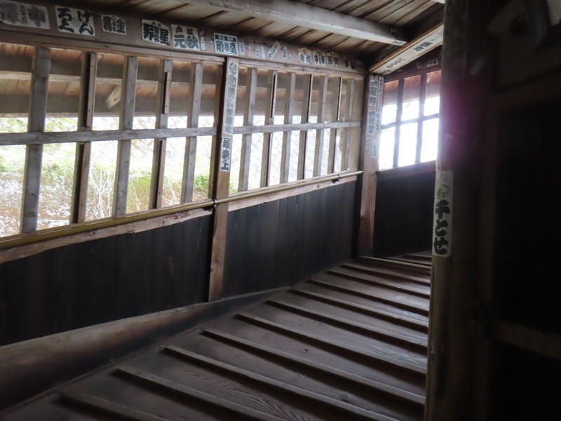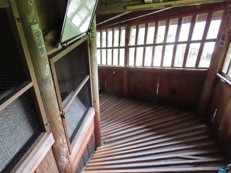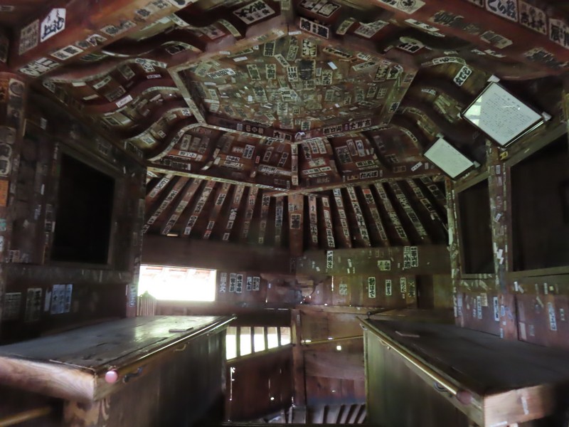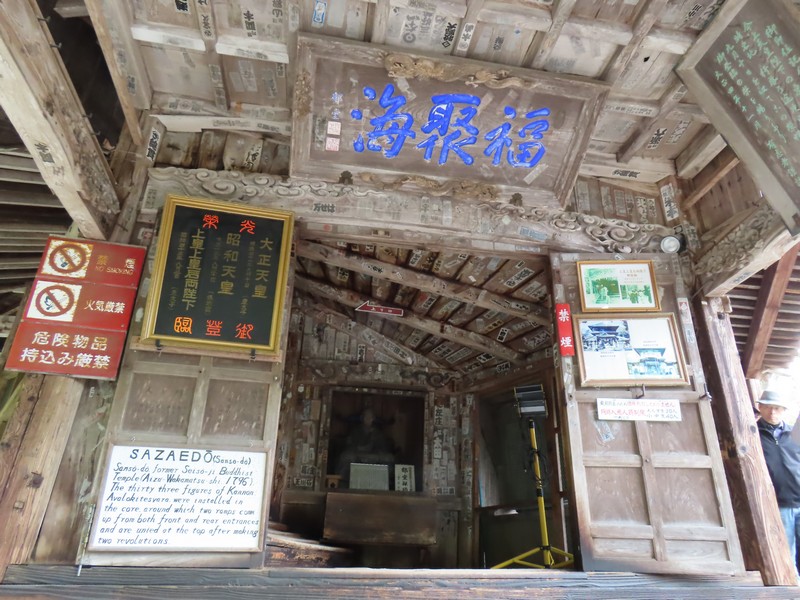 さざえ堂。旧正宗寺の円通三匝堂で、1796年に建てられたもの。階段がなく上り下りが別の一方通行という、世界でも例を見ない建築とのこと。登っていくと足元からは軋む音がするし、傾いた窓枠やこの通路がちょっと平衡感覚がおかしくなって来る。確かにピサの斜塔も傾いているので上り下りに変な感じになったよね。桜桃子もピサの斜塔を登ったのかな。このらせん状のスロープに沿って西国三十三観音像が安置されていて、このお堂をお参りすることで三十三観音参りができるようになっている。階段に沿って一番上まで行くと、屋根裏にはたくさんの千社札。なんとも不思議な空間だ。前から人が来ることなく上り下りを行い、これでお参りできたかな。