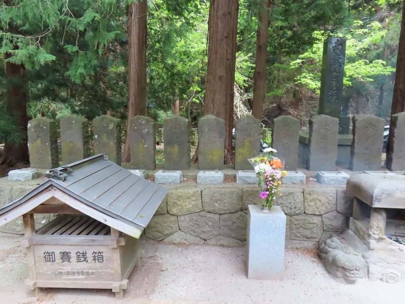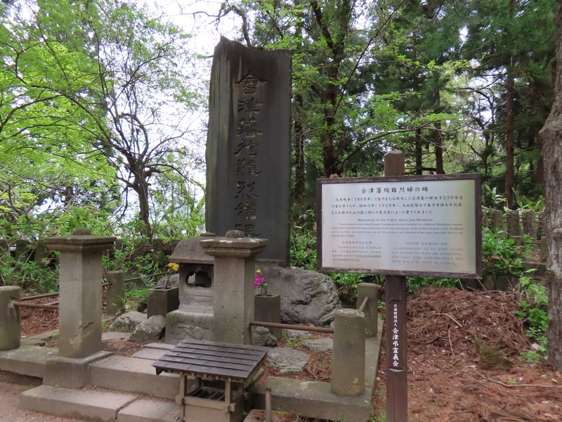 この先へ進むと、最初に見た長い階段と合流する。そのまま上がると広場に出てきた。ここには白虎隊十九士の墓と会津藩殉難烈婦の碑がある。すさまじい歴史を伝えるものだ。その脇には松平容保公弔歌の碑がある。主君としての想いはいかほどだったか、想像できるものではとてもないが、少しでも考えてみよう。ローマ市寄贈の碑もあり、これは白虎隊の精神に感銘を受けたローマ市より寄贈されたもの。さらにドイツ大使館の書記官から贈られたドイツ語の碑もある。世界的にも知られた出来事なんだね。唯一の生還者、飯沼貞吉(のち貞雄)の墓もあり、この人のおかげでこの悲劇が世に知られることにもなった。