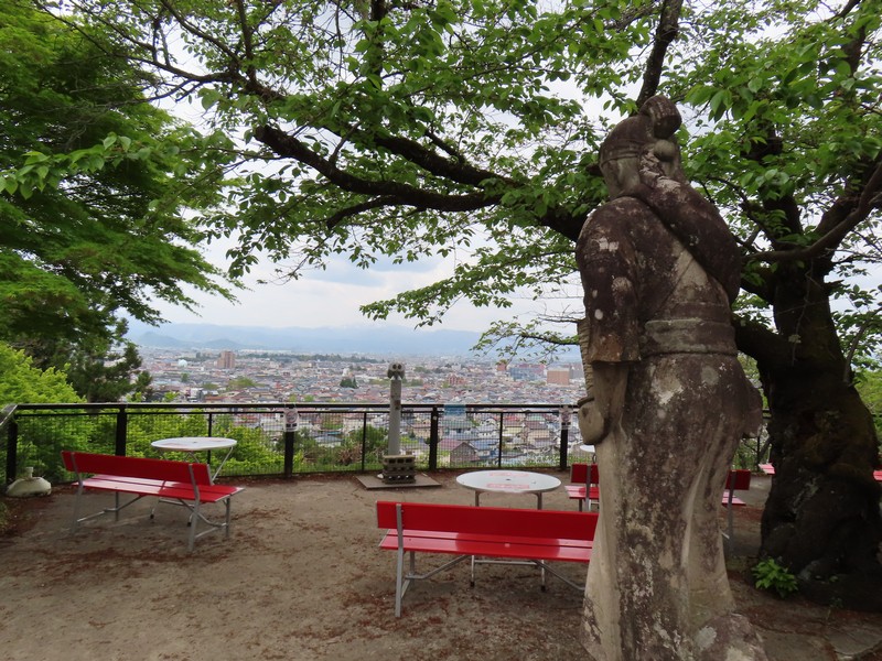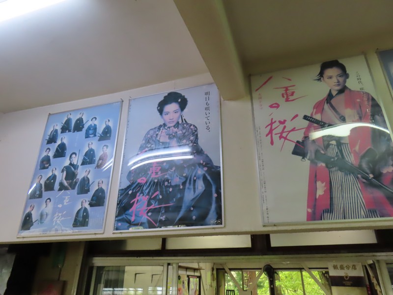 ではいよいよ、白虎隊士自刃の地へ。開けたところに出てきて、街が見渡せる。白虎隊士の石像が見る方向をよく見ると、確かに鶴ヶ城が見えている。ちょうど間に白いポールが立っている。これは目印として建てたもの?ほかの役割があるようなポールに見えないので、恐らくそうなのかな。この石像からだとちょうどポールと鶴ヶ城が重なるので、少し場所をずらしても撮ってみる。それにしてもここから城を見て、火の手が上がっているのを見て絶望して自刃する、考えられない精神状態。それだけの忠誠心を持っていたこととそこまで追い込まれていたこと、本当にすさまじい状況だったんだな。ひとしきり、この場で思いを馳せる。ここから少し階段を下がったところにも開けたところがあるが、そこにも石碑があって鶴ヶ城方面を見ている。お土産屋さんに入ると、ここはやっぱり八重の桜、ありました。これは絶対、再放送を見よう。
