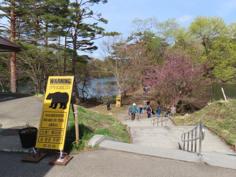 1時間ちょっとのドライブで、裏磐梯物産館に到着。ここが五色沼ハイキングの出発地点となる。まずはお昼ごはん、会津山塩ラーメンをいただきます。透き通ったスープがさっぱりとして、麺も喜多方風の縮れ麺。おいしいです。さて、では準備は万端。クマ注意の看板は出ているが、さすがに人は多いので大丈夫でしょう。五色沼ハイキング、出発だ。