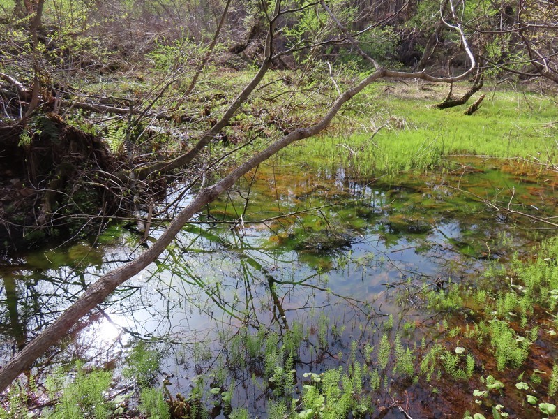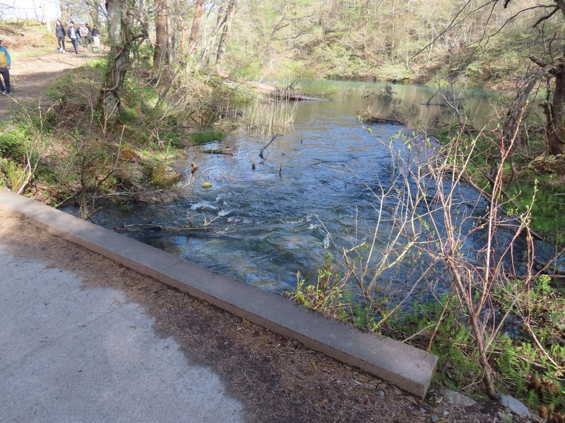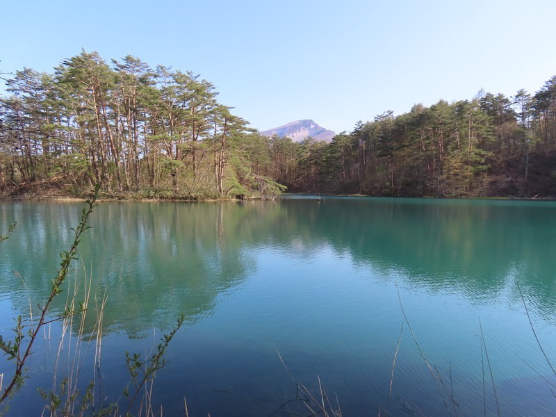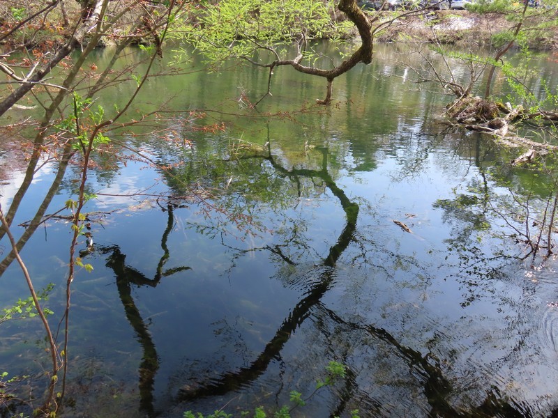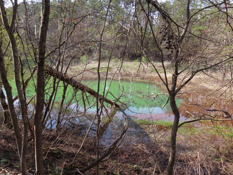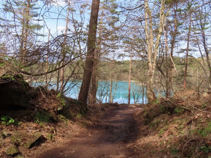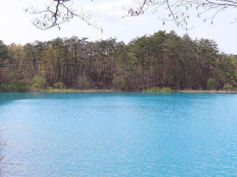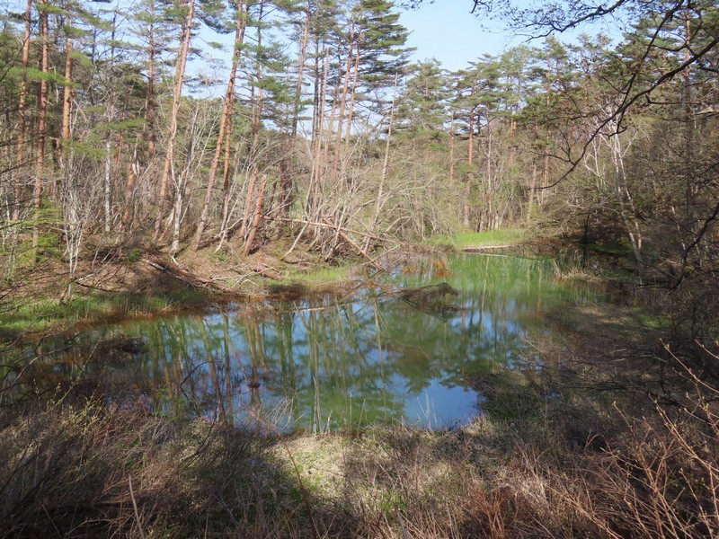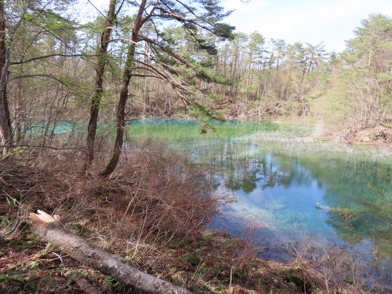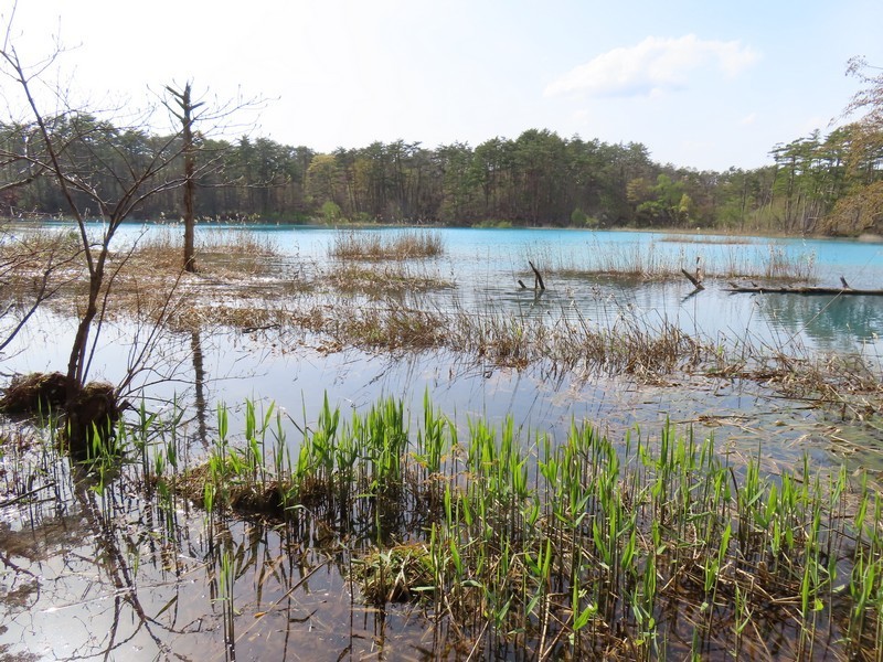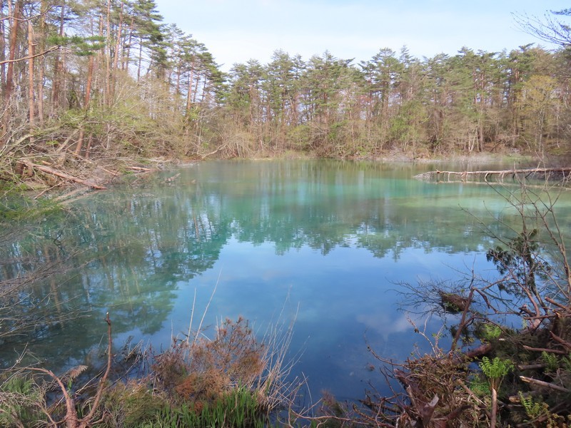 次は青沼。名前の通り青く見えるのは、ウカミカマゴケという水生苔が繁茂しているため。季節によってはもっと青い色になるらしい。ここからはよくわからないが、水面近くにある葉は水中の鉱物によって白くなるとのこと。