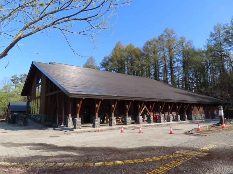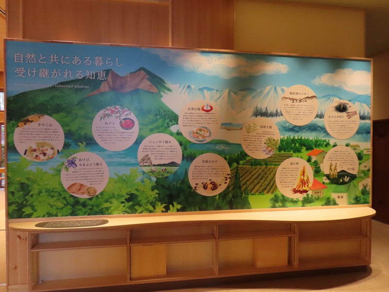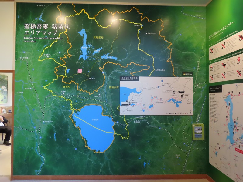 ハイキングの終了地点にはレストランやお土産屋さんがある。日本赤十字社災害活動の碑があるが、これは明治21年に磐梯山の噴火が起こった際に日本赤十字社が国内初の災害救助活動を行ったことの記念碑。そんな歴史もあるんだね。ここから少し歩くとビジターセンターに到着。ここがこの散策のゴール、五色沼入口のバス停があるところ。バスは16:46なので30分ほどあるかな。しばらくはビジターセンターで展示を見て、今日のハイキングの振り返りなどとしましょう。地図を改めてみたりこのあたりの自然の恵みを知ったり、四季の変化の説明を見たりと、いろいろ勉強になります。