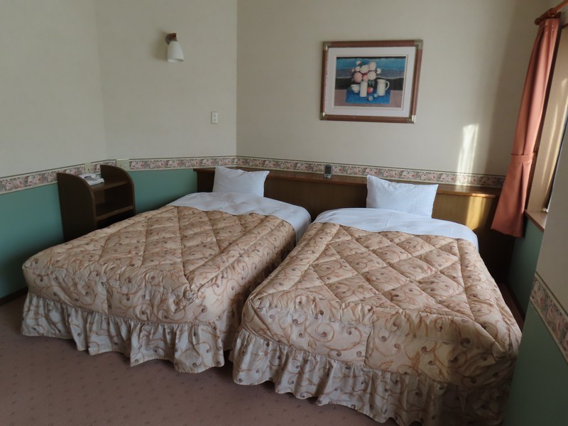 そろそろ時間かな。バス停に行くと、すでに待っている人がいる。定刻になり、バスが到着。2時間近くかけて歩いた散策路、バスで戻るとわずか5分とあっという間に裏磐梯物産館に到着。さっきはお土産屋さんもラーメンも賑わっていたが、今はもう閑散としている。車に戻り、では今日のホテル、イルレガーロへと向かいましょう。今度は車でビジターセンター方面へと向かい、すぐにホテルに到着。ここからなら歩いてもビジターセンターまで行けるくらいだな。まずはチェックイン、部屋に入って少し休憩。広くてかわいい感じのベッドが並ぶゆったりした部屋だ。お疲れさまでした。