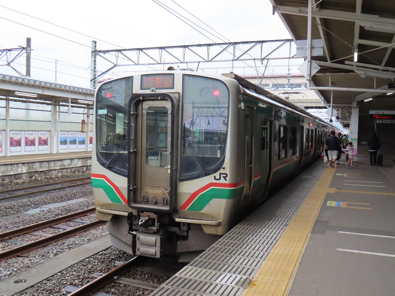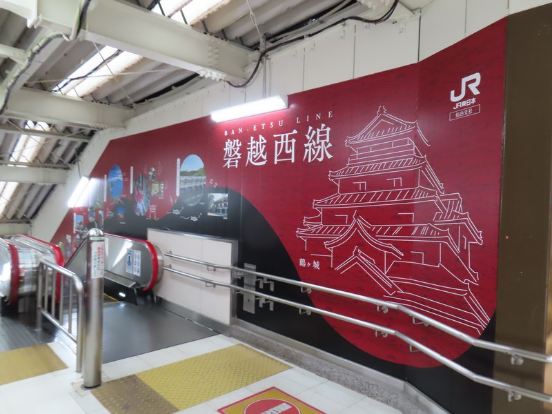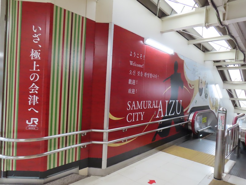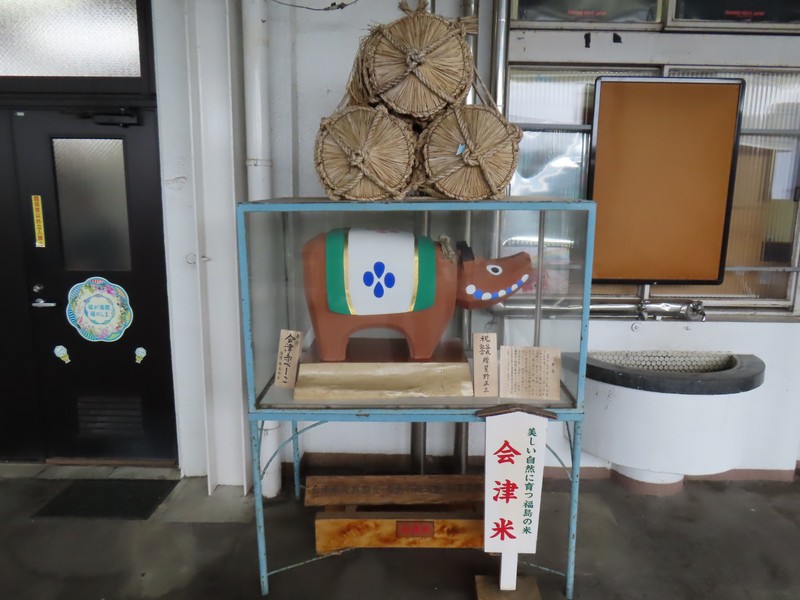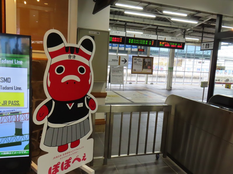 雨の中、1時間ほど走って会津若松駅まで戻って来た。無事に車を返却し、郡山行きの電車まで1時間ほど。駅のお土産屋さんを見ましょうか。赤べこデザインのお菓子や喜多方ラーメンなど会津の名品、これで買い納め。いろいろ買ったな。再びぽぽべえに挨拶し、ホームへと行きますか。13:30発郡山行きの電車はそれなりに混んでいて、1時間ほどの旅では車窓の猪苗代湖も少しの間楽しめました。14:36、郡山駅に到着。