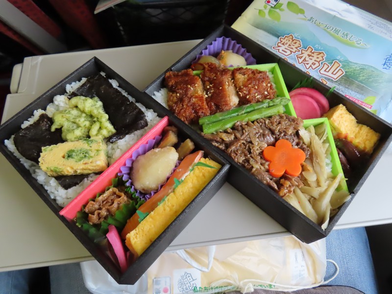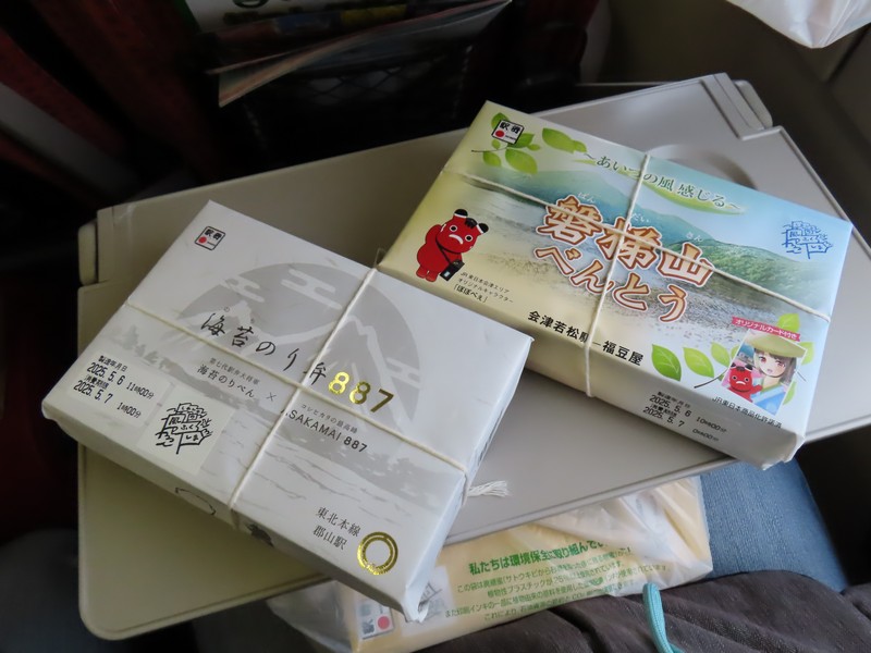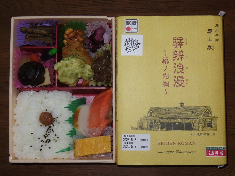 ホームに上がって来た。久しぶりの東北新幹線だな。郡山駅は通過もあるので、目の前をはやぶさ号があっという間に通り過ぎていきました。そしてしばらくして、やまびことつばさの連結列車が到着。予約しているのはつばさ、こちらの方が座席が2-2で広いのだ。満席の東京行きは15:30に郡山駅を出発、駅弁「磐梯山べんとう」と「海苔のり弁887」をいただきます。家に帰ってから、夜ごはんには「驛辨浪漫〜幕ノ内編〜」をいただきました。福島の地元食材などいろいろと入った、おいしい駅弁でした。