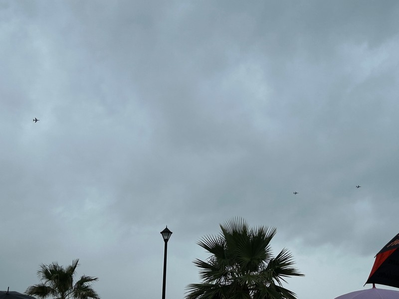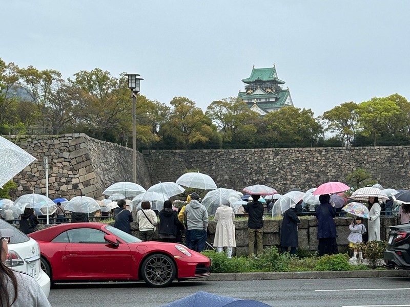 大阪城サイドでは、小雨振る中をお城の見えるポジションでフライトを待つ。そろそろ関空を飛び立つという頃、本日は中止との速報を知った人がいて待つ人の間ですぐに広まっていく。この天気なのでその結果も予想はしていたが、残念だな。1時間前か1時間後なら飛べる天候だったようだが、こればっかりはどうしようもない。解散しますか。