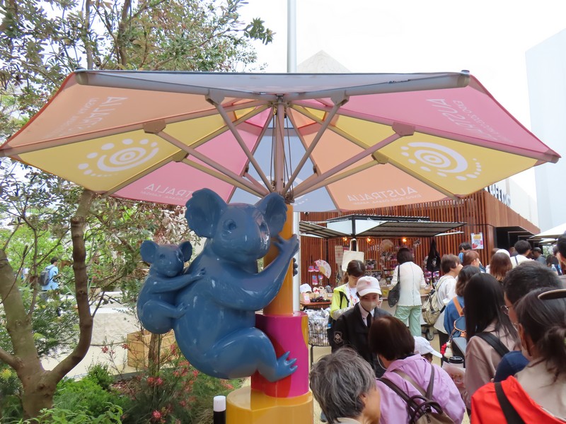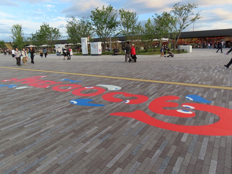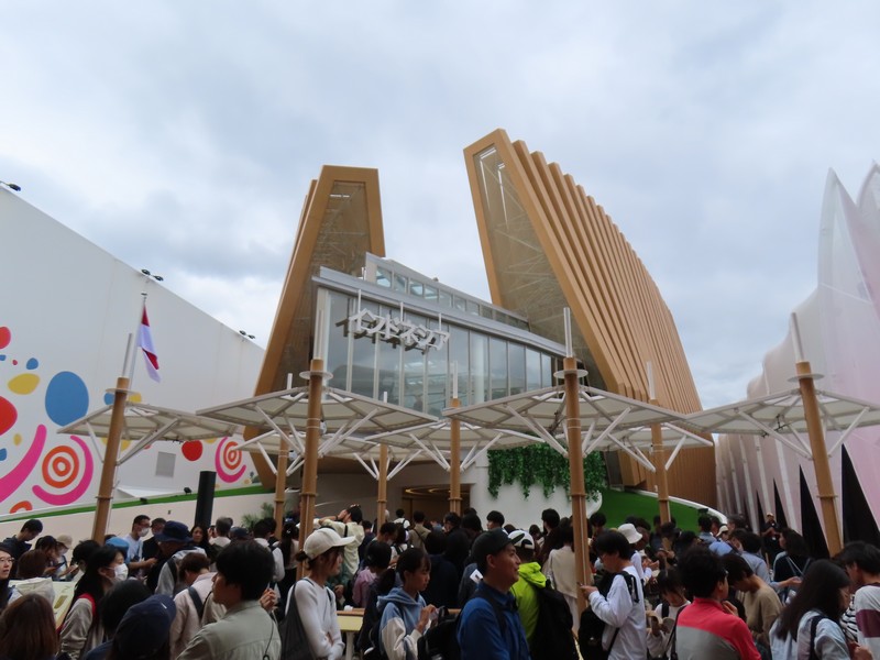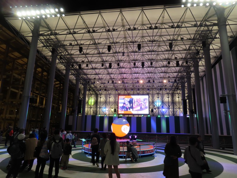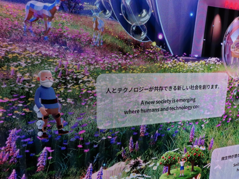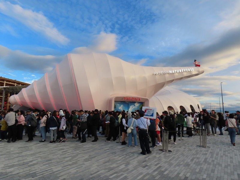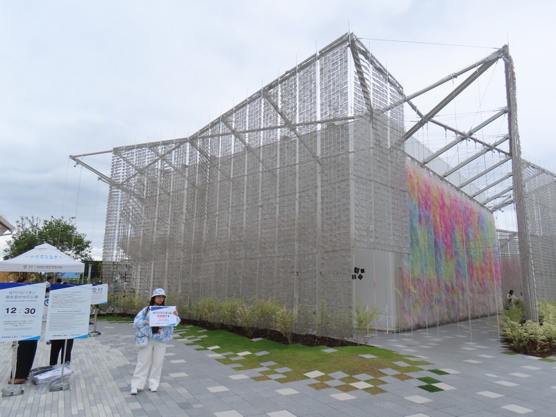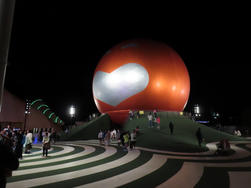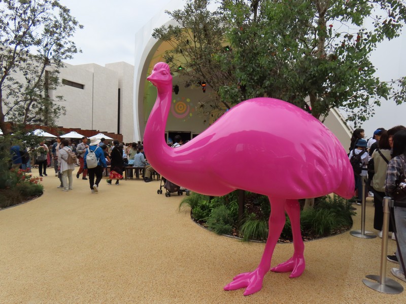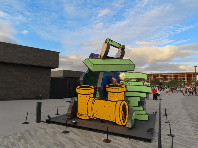 少々食休み。ゆっくり歩いていこう。西ゲートあたりをのんびりしていると、何やらオブジェを発見。説明を見てみるとさっきのサンゴの記憶と同じく、EXPO PUBLIC ARTという取り組みで、万博会場内の13か所に日本のアーティストによる作品が展示されているらしい。そうか、それなら他も気にしてみてみよう。この作品はHard Boiled Daydreamという作品で、身の回りの物のサイズ、用途、価値などを無視してつなぎ合わせることで二次元と三次元、現実と仮想、過去現在未来などを表現しているとのこと。うーん、現代アート。