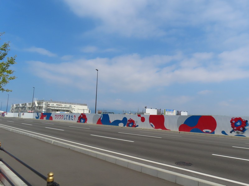 西ゲートへの歩行者用通路は8時半から開くのだが、今はもう誰もいない。30分前にはここにもたくさんの人がいたんだろうな。西ゲートまでの道は影がないので、慌てずに行きましょう。道沿いの壁に描かれたミャクミャクなど、前にも見たはずだがやっぱり写真撮りながらになるよね。そんなこんなで15分ほどで西ゲートに到着、11時入場の列に並ぶ。