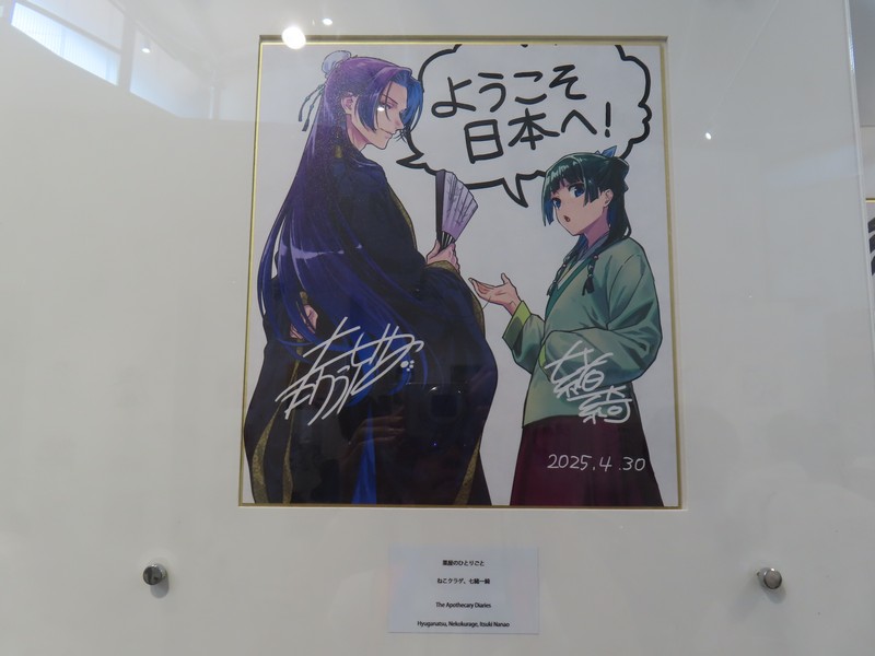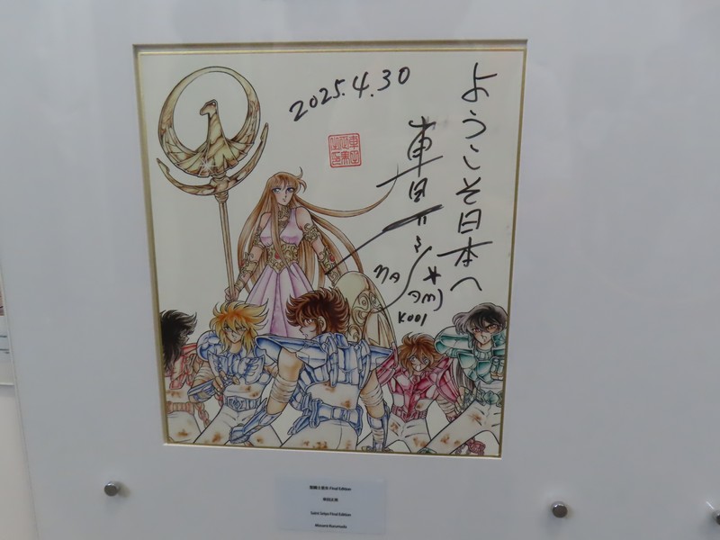 11:10を過ぎたので、11時組がちょっと落ち着いたころ。そろそろ行きますか。「漫画家メッセージボード展」は4月にもごく短期間WASSEで実施されたらしいが告知がほぼなかったことや期間が短すぎて見られる人が少なかったことから、告知ベタとの書き込みがSNSであふれていた。その再開になり、新たな色紙もふえたとのことなので、これは見ておきたい。この部屋は、前に隕石を見た部屋だよね。壁にはたくさんの色紙が飾られていて、どれも著名な漫画家先生のもの。聖闘士星矢や東京リベンジャーズ、薬屋のひとりごとやジョジョの奇妙な冒険、呪術回線に僕のヒーローアカデミアなどなど往年の名作もあれば最近のものもある。流れ星銀牙なんて懐かしいな。