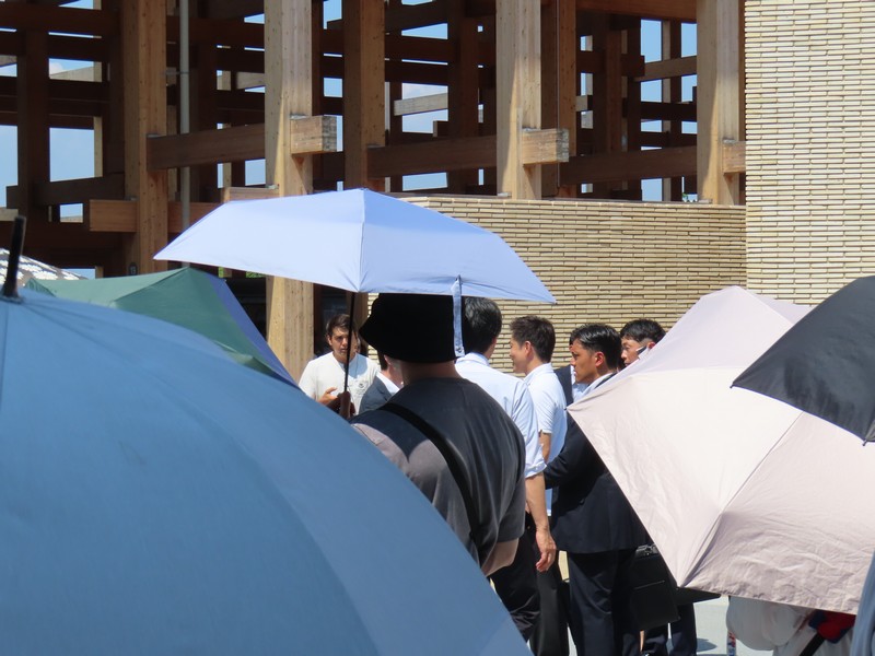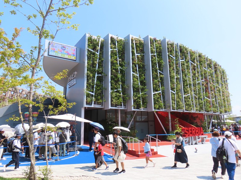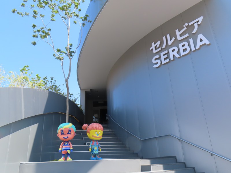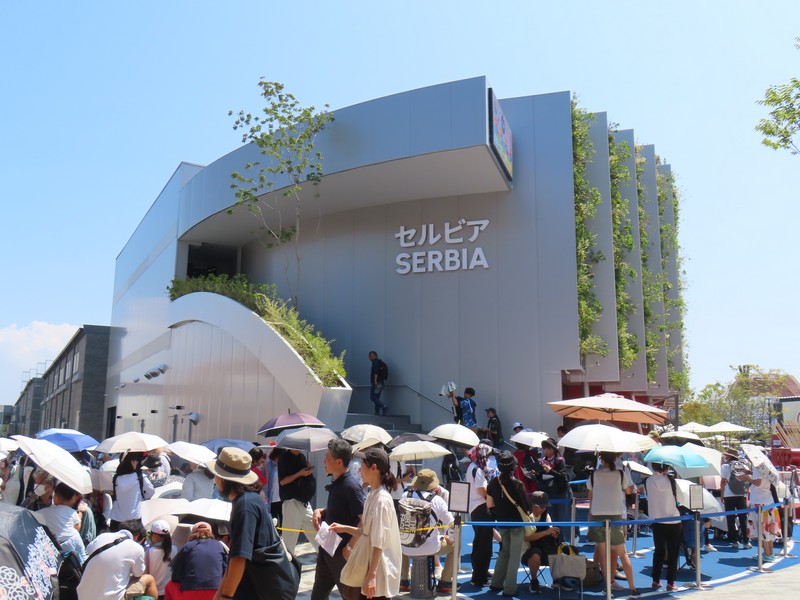コモンズを除くと、未訪問の海外パビリオンはあとセルビアとベルギーのみ。どちらもかなり並ぶが今日一つは見ておこう、ということでセルビアへ。11:40くらいに着くとそれなりに列はできているがまあまあかな、と思っていたら現在行列制限中のためこれ以上並ばせてもらえない。係の人は今は並べないからこのあたりからは離れて、というが並びたい人が多数様子をうかがっている状態。どう見てもまだスペースはあるし、ここは大屋根リング下もある。すぐ近くのイタリアもシンガポールもオランダも、みんなリング下に列を作っているのにそれをせず、並ぶなの一点張り。そうは言われても様子をうかがう人は徐々に増えるし、何か動きがありそうなら近づくし、その都度離されるけど通路にたまるし、何もいいことがない。30分以上たち、ある程度列が進んだ段階でそろそろ並べそうな気配が出ると人は近づいていき、係の人がそろそろ再開すると言ったとたんに人が押し寄せそのまま塊の行列になってしまった。係の人は走るなとかちゃんと順番にとか叫んでるけど、いやそれは無理だって。なんで最初からリング下に並ばせないのよ。これはどう見ても運営側の問題。結局ぐちゃっと集まった人がなんとか整列した形になったけど、だれも幸せにならないやり方。これは何とかしてください、運営さん。そんなことを隣になった人とも話したりしていると、奥の関係者用ゲートから吉村知事ご一行が登場。視察なのか、そのまま隣のウズベキスタン館に入っていきました。見るとそのウズベキスタンも、ちゃんとリング下に並べるようになっていました。