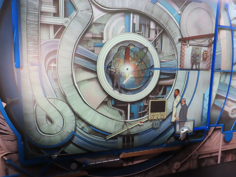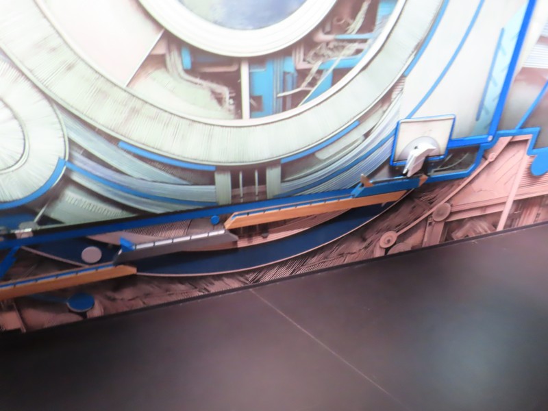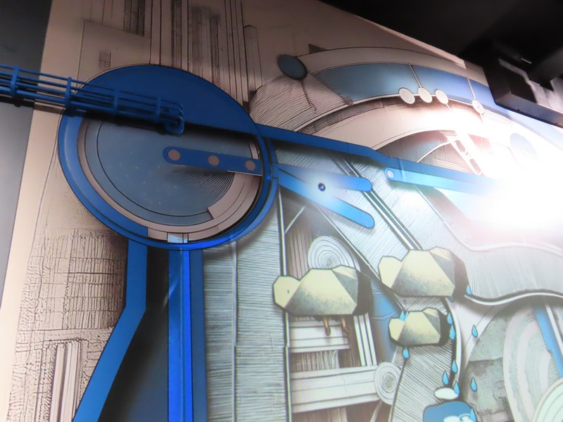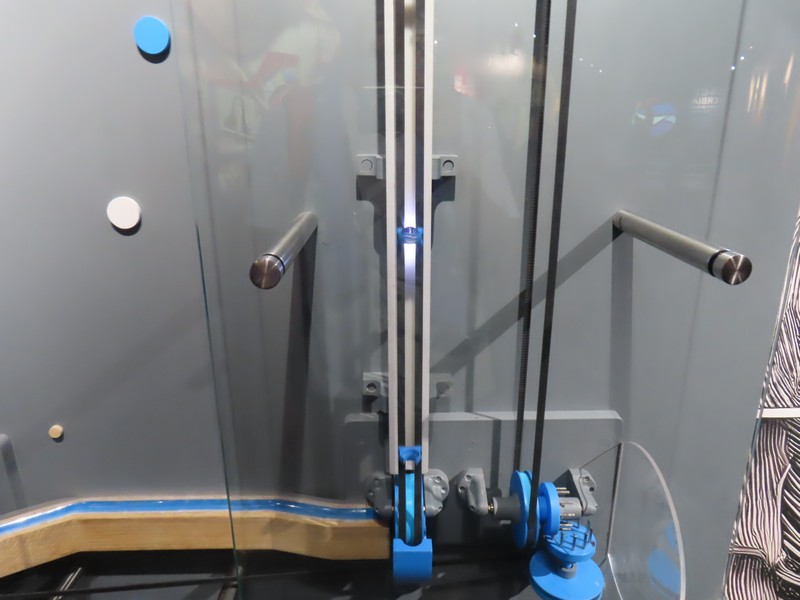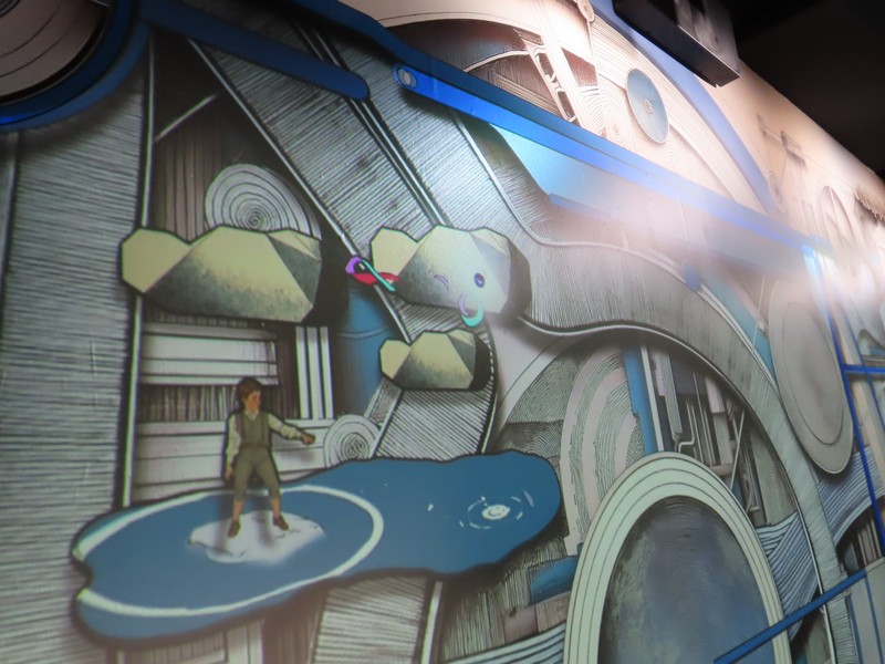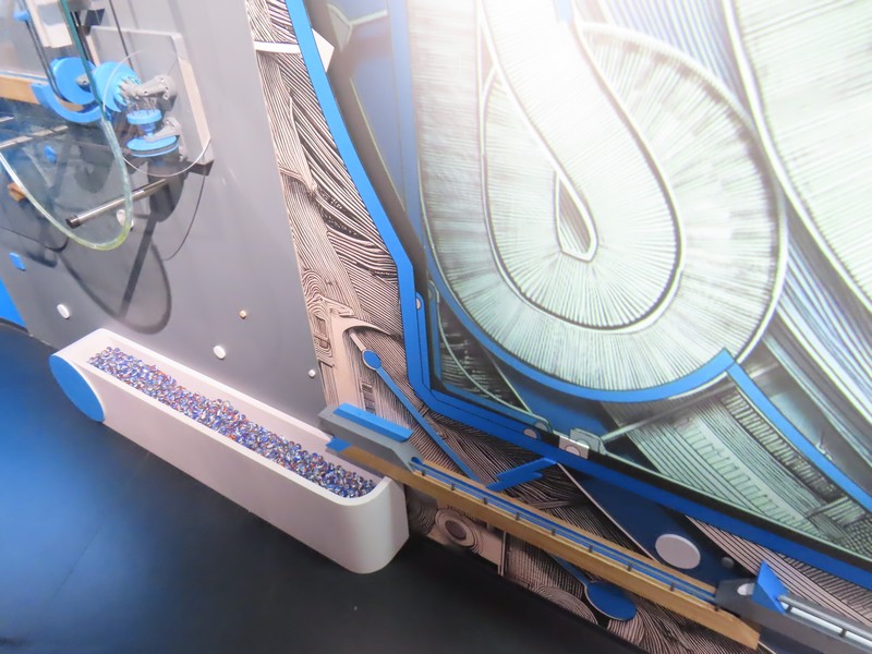 壁にはビー玉と入れる装置があり、そこに一つ入れるとピタゴラスイッチのようにその仕掛けに沿って動いていき、上まで運ばれたビー玉が下に落ちる時にはモニタ上の映像の上でいろんな仕掛けを通って落ちたりまた跳ね上がったりする。その動きに合わせてセルビアの科学者やスポーツ選手の説明が表示されたりする。そしてその映像のビー玉が下まで落ちた時、そのまま実物のビー玉が現れる。この不思議な動き、おもしろいですね。同じような動きをする装置が色違いに4か所あり、それぞれ楽しむことができる。