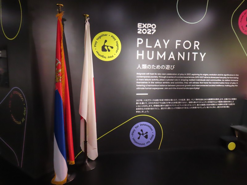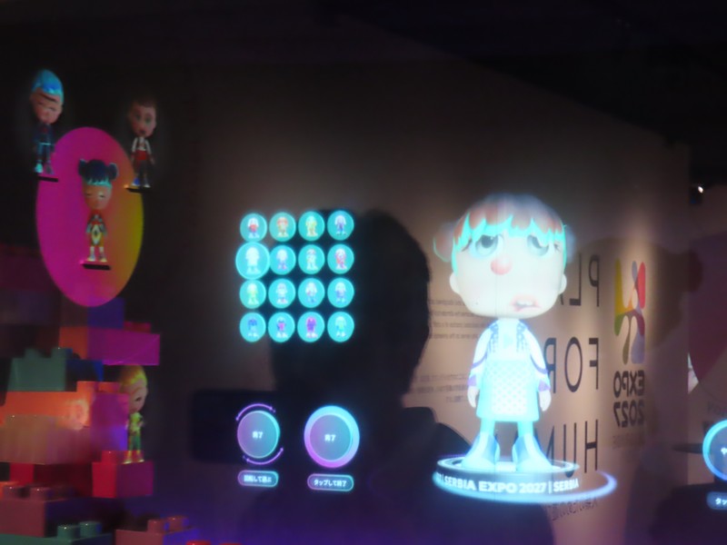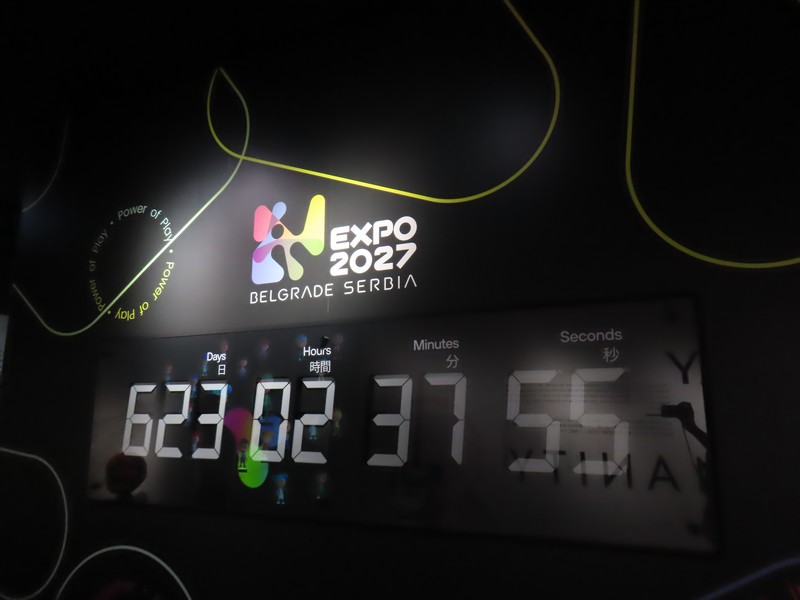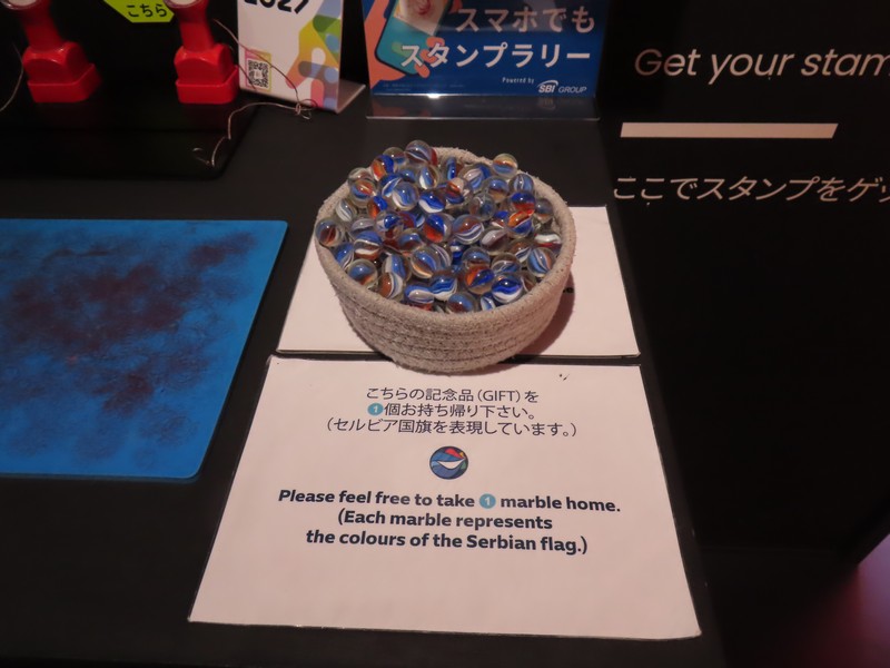 パビリオンの入口にもいたが、あちこちにいる子供のキャラクターは27年ベオグラード万博のキャラクター。そのキャラクターを自分でデザインできる「遊び」もあり、まだ途中なのか福笑いのような状態になっているのが見えた。こうした「遊び」をテーマとしたベオグラード万博、開幕までのカウントダウン表示もあり、あと623日。まああっという間だろうね。どんな万博になるのか、楽しみだ。日本も出るようなので、日本ならでは「遊び」が展示できればいいね。パビリオンの出口手前にはスタンプがあるが、そこでビー玉を一ついただける。よくある色合いだが、セルビアの国旗の色。楽しめました。