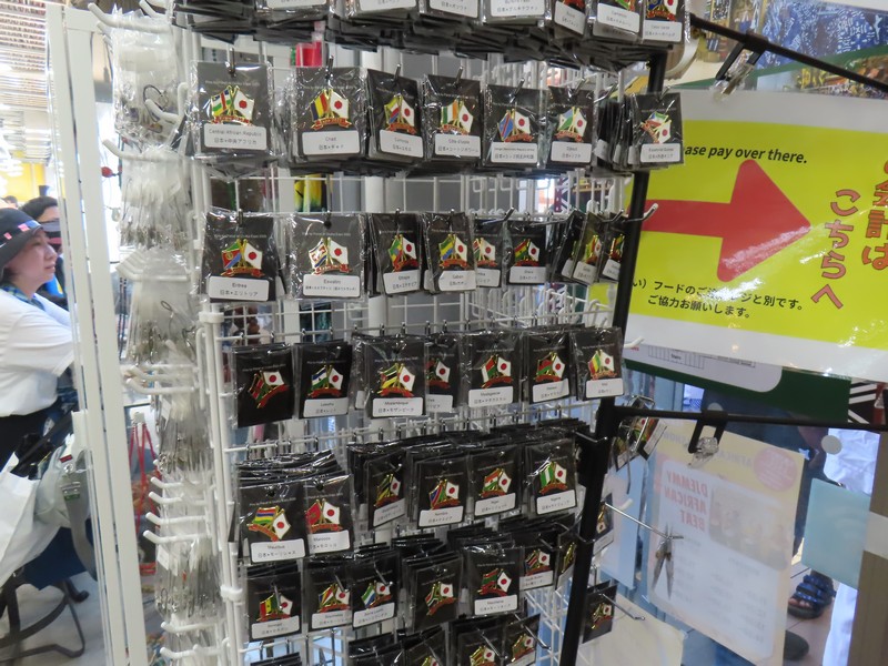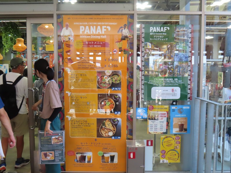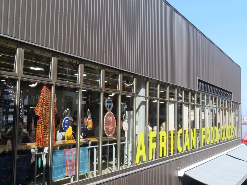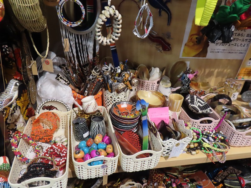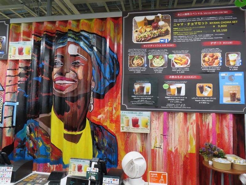 お店の中にはショップがあり、アフリカらしいアクセサリーや動物のオブジェ、布や革の雑貨などいろいろ売っている。国としてはマリとジンバブエのものがメインになっているようだ。やっぱりキリンやゾウ、ライオンなどアフリカ感のあるものがいい感じですね。しばらく見ていると、太鼓を持った人が出てきて始まったのがアフリカン・ドラム・ショー。迫力ある太鼓の音が店内に響き渡る。こういうライブ感もいいですね。あとは国旗クイズ。アプリのクイズで2分以内にアフリカの国旗を10問4択で答えるのだが、これは得意分野。4択ならまず間違うことはないので、全問正解して国旗のピンズをゲット。渡されたのはタンザニアでした。