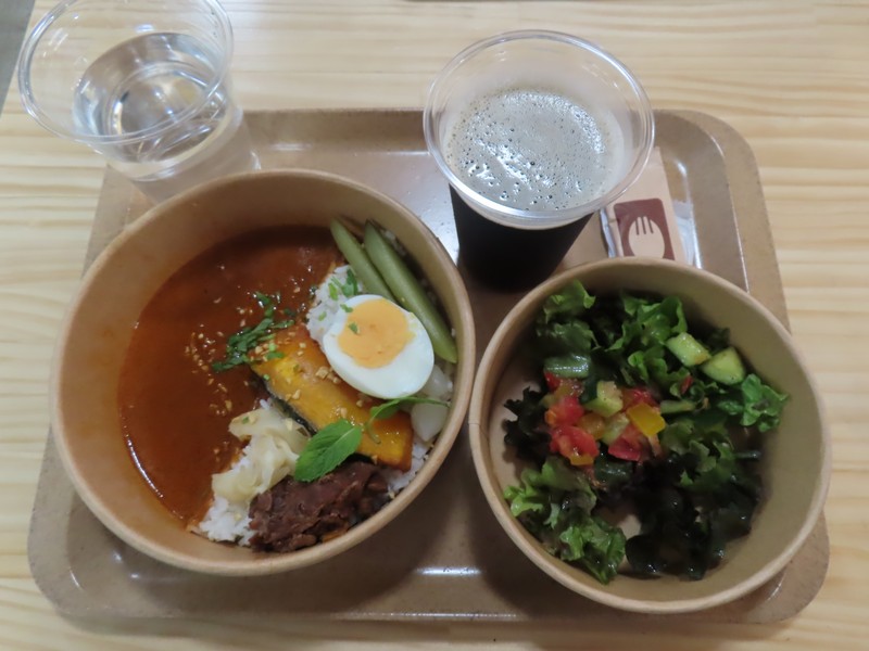 さて、お昼ごはん。今日は今まで気になっていた、アフリカ料理のお店へと行ってみよう。ちょっと高めではあるが、そんな食べる機会もないしね。北側のマーケットプレースにあるお店に行くと、20人くらいの行列。隣のラーメン屋さんの行列かと思ったら、アフリカ料理屋さんでした。みんな興味あるのかな。お店は結構広いので列は進み、20分くらいで入ることができました。マフェ・セットという、西アフリカの料理をいただきましょう。ドリンクはクラフトビールで、エチオピアのコーヒー・ポーター。もう一つ、マダガスカルのバニラ・エールも気になるが今日はコーヒーで。まずはビールをいただくが、これがほのかにコーヒー風味のある香ばしい味わいで、実に飲みやすくておいしいビール。これはいいなあ。マフェというのはピーナツバターの入ったビーフシチュー。ピーナツバター単独は少々苦手だが、こうして料理に入ると十分満足。おいしくいただきました。