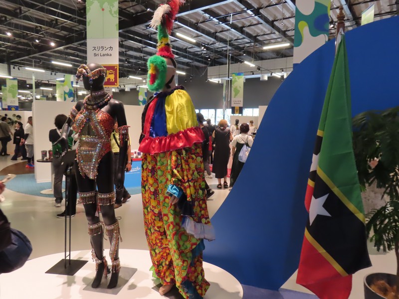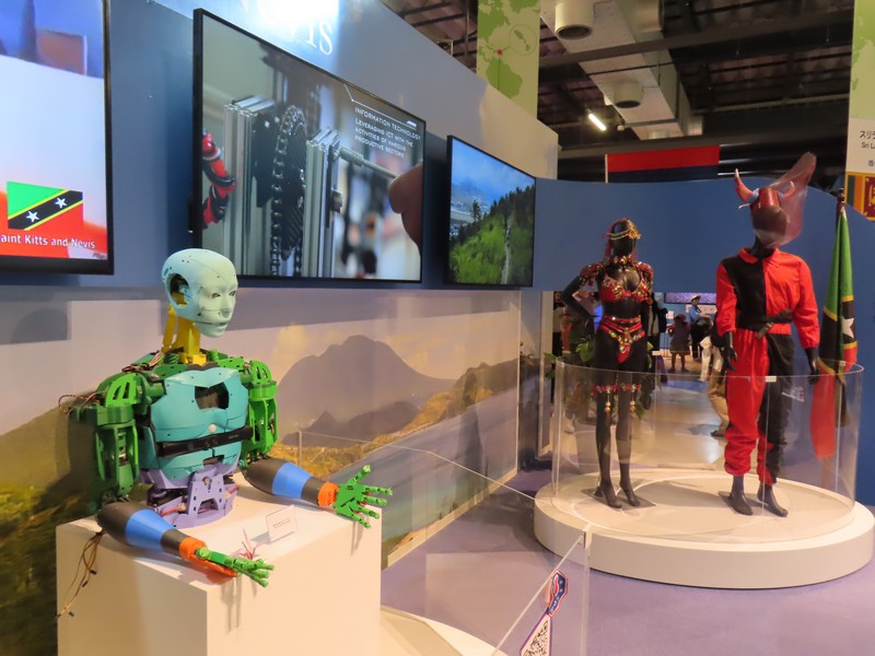 カリブ海・首都バセテール。こちらも英連邦に属しており、セントクリストファー島とネーヴィス島からなる。島の名前はセントキッツ島なので、セントキッツ・ネーヴィスと呼ばれることもある。ここの展示はカラフルな衣装とカラフルなアンドロイド。このアンドロイドはサトウキビやトウモロコシを原料とした植物性プラスチックでできており、3Dプリンタで作ったとのこと。現地の大学生による作品だそうで。モニタには、美しい海などの景色が映し出されている。