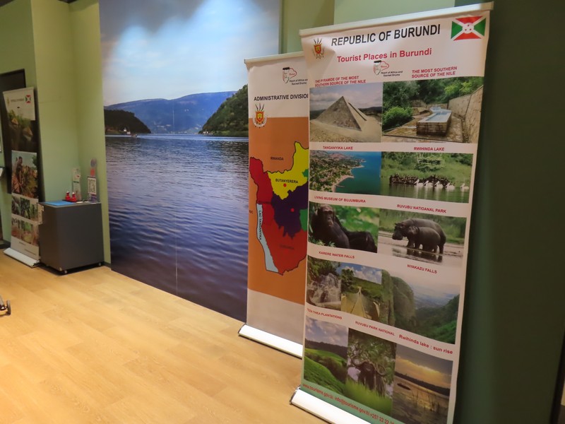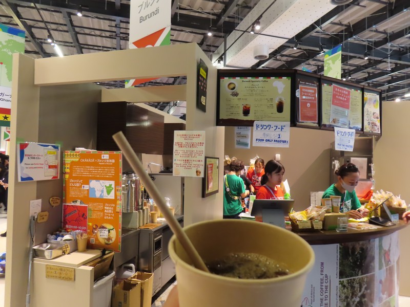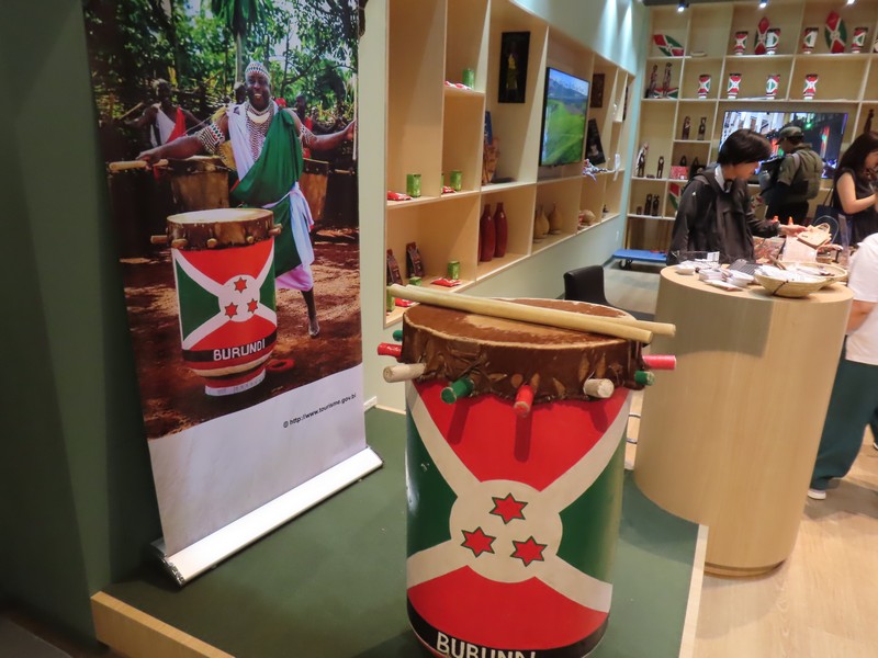 東アフリカ・首都ブジュンブラ、と思っていたら2018年にギテガというところに変わったらしい。ここは6/15に来たときはナショナルデーでドラムの音で盛り上がっていたし、7/27は合間の時間でアイスコーヒーをいただきました。ということで3度目ではあるが、ブースを見に来るのは初めてだ。入口にはそのドラムがあり、自由に敲くことができる。しっかりした音なので、これが複数あると迫力があるんだな。ブース内にはブルンジの工芸品などの展示があるが、国旗自体のデザイン性がいい感じだ。タンガニーカ湖や国立公園、そこにいるカバなどの動物の紹介もあり、今まであまり知らなかったブルンジの多様な面を知ることができました。となるとやっぱりブルンジコーヒー、ブースを訪れたことで5%オフのクーポンをいただきアイスコーヒーをいただく。すっきりしたのど越しの、おいしいコーヒーだ。