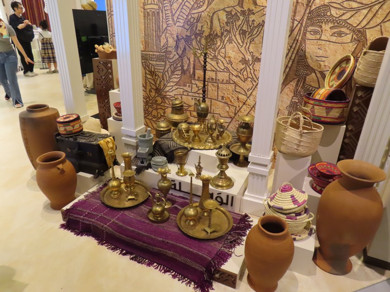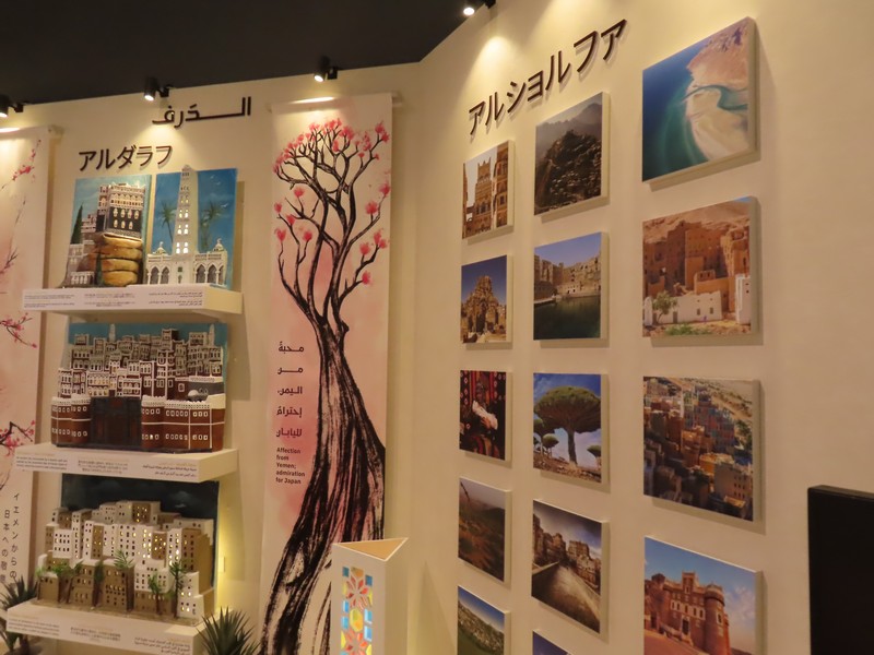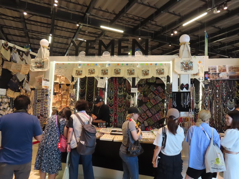 中東・首都サナア。カリブ海やアフリカを見続けてきての中東、アラビア文字や展示物、風景写真などかなり雰囲気が違う。入口には中東感あふれるティーセット、中に入ると各都市を紹介する写真や映像、模型など。アルショルファ、アルダラフ、アルザウフ、アルトナブ、アルメドマーク、アルヌーラと記載があるがこれは何?地名なのかと思ったら、アルヌーラは光、アルトナブは縄という意味らしい。他の言葉もそれぞれ意味がありそうで。なかなか行くことのない場所とは思うが、イエメン門など魅力的な観光地もありもし何か機会があれば。すぐ近くの別のブースはイエメンの露天商をイメージしており、たくさんのアクセサリーなどが売られている。ここでは値切り交渉ができるようで、本場ほどのシビアさはないだろうがそんな疑似体験も楽しめる。