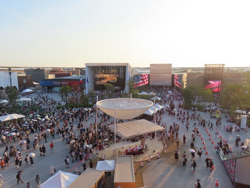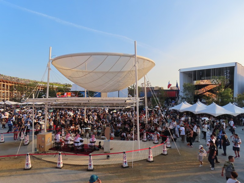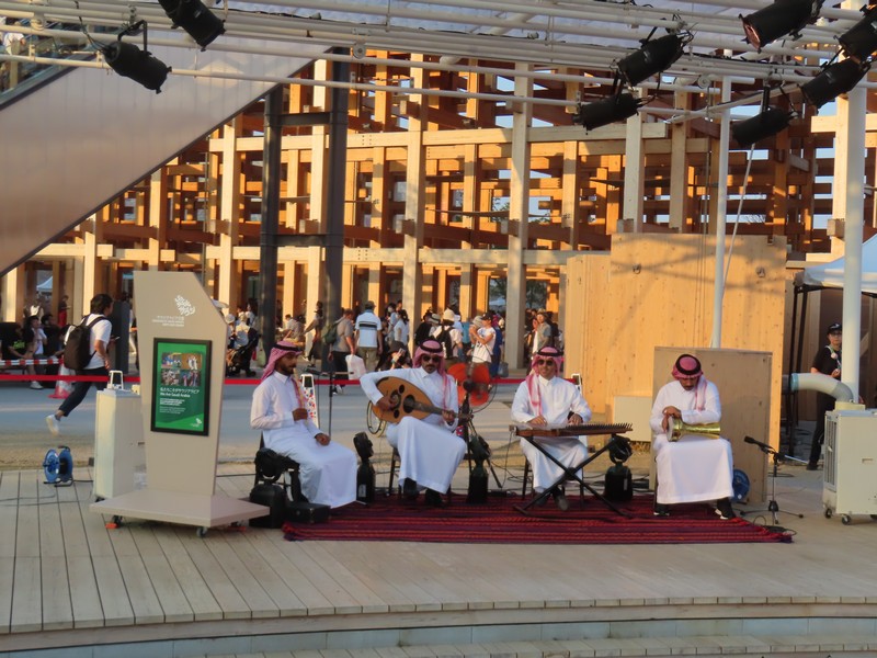 夕方になり、少し気温も下がり日差しも柔らかくなってきた。相変わらず人は多いが、8月の終わりのこの感じ、あと1か月半となったこのお祭りのような感じ、行きかう人の楽しそうな様子を感じているとなんだかちょっと泣けてきた。アメリカ館前の光の広場は人でごった返しているが、ポップアップステージ東内で演奏されているのはサウジの伝統的な音楽。夕方の光にあうゆったりしたテンポがいい感じだ。