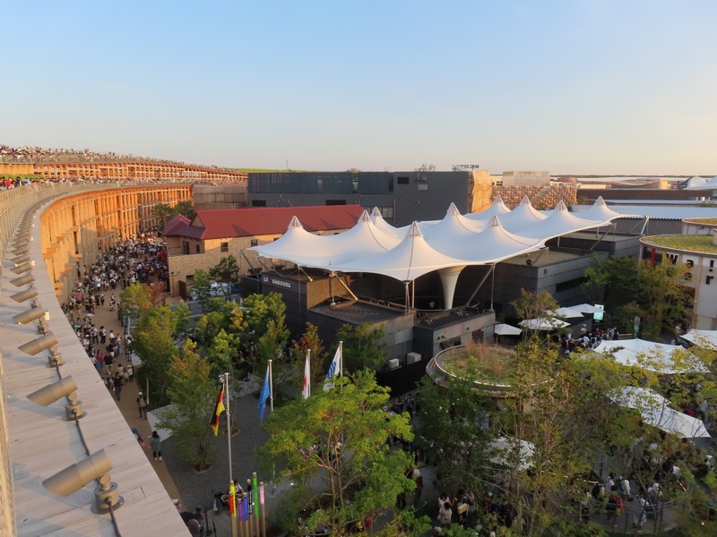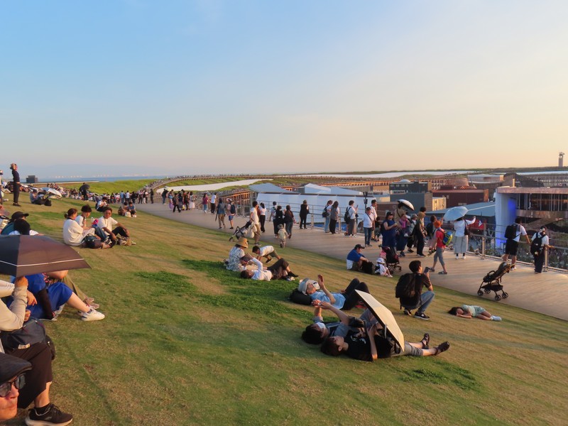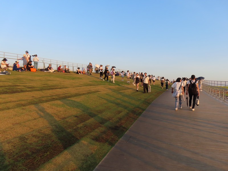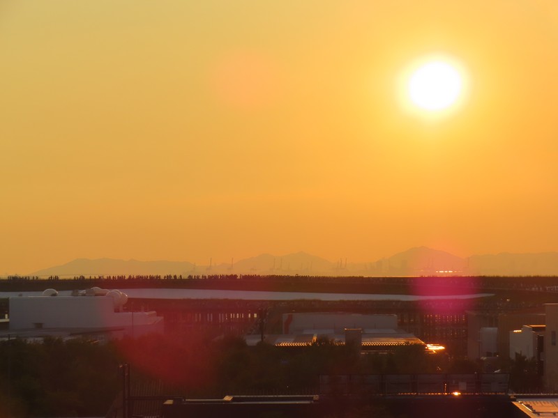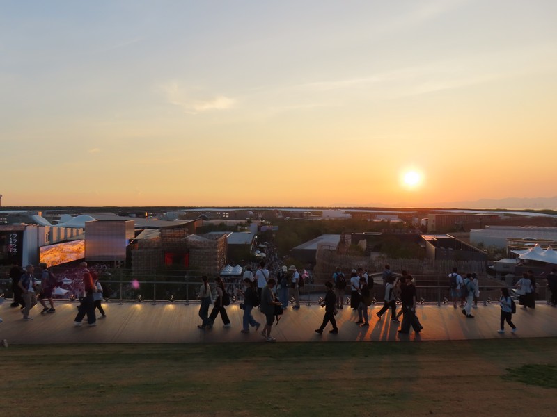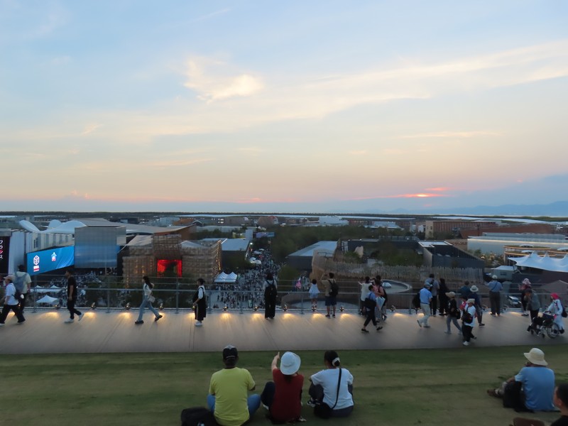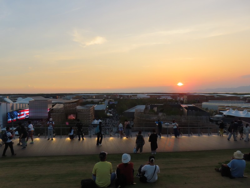 リングの外側を上まで登ると、ちょうとフィリピン館の前あたりに来る。ここからはほぼ正面に夕日が見えるので、しばらくゆったりしましょうか。この辺りは芝生になっていて、夕日を見に来たのか下の混雑を避けているのかゆったり寛いでいる人がたくさんいる。18時を過ぎ、日没が近づいてきた。オレンジ色の夕陽はリングの西側も照らしていて、向こう側にもたくさんの人がいるのが見える。あの人たちは、海越しの夕日を見ているんだろうな。ヘルスケアだろうか、遠くに音楽が聞こえる穏やかな中を夕日は徐々に沈んでいく。しばらくして、西側リングの向こうに見える山の影へと沈んでいきました。ふう、暑かった今日も一気に過ごしやすくなってきた。