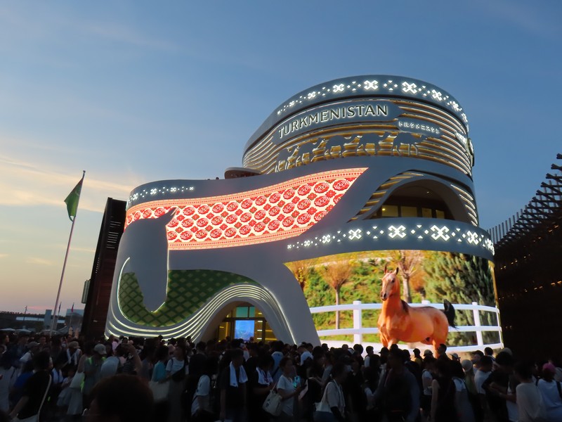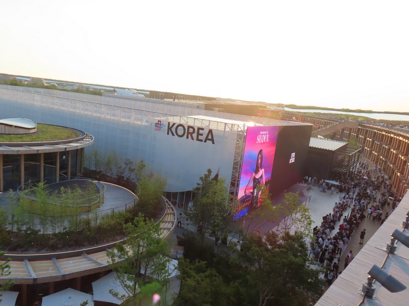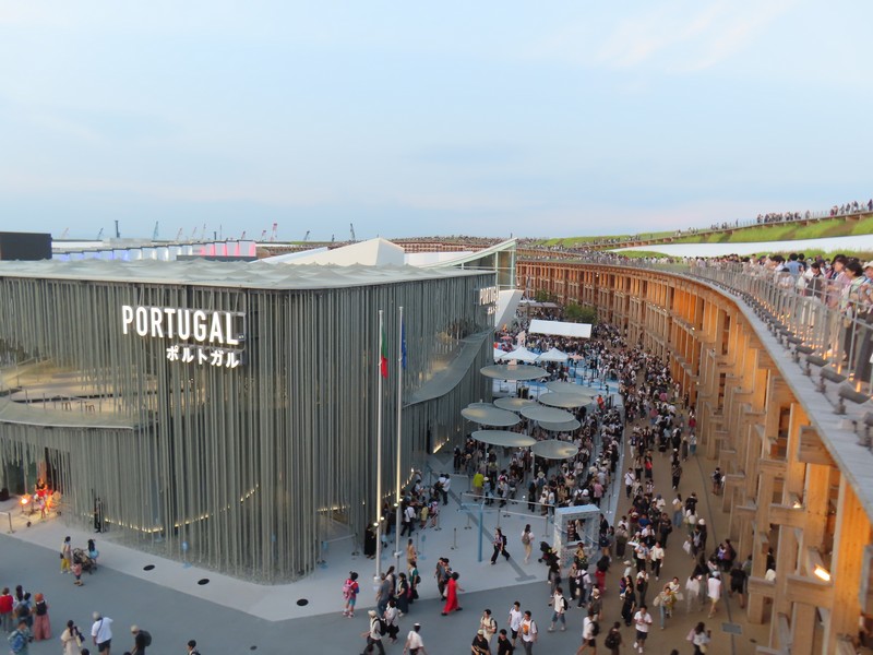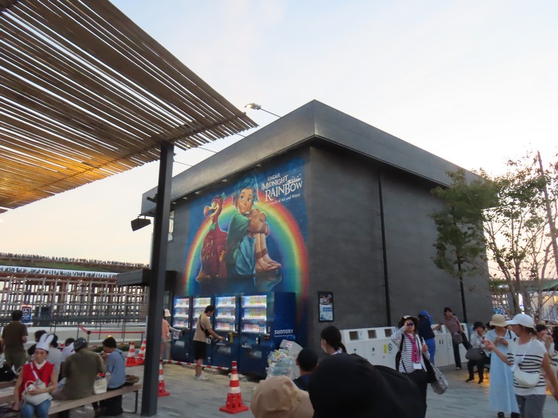 夜のショー「アオと夜の虹のパレード」は19:30から行われるが、明日8/31に観覧席での予約が取れている。できれば正面の席に行きたいので、今日は下見に行こう。リング沿いにポルトガル館まで歩き、エスカレーターで降りるとコロンビアやスイス、オーストリアにクウェート、中国そして左にはバーレーン。もう見慣れた景色になってきた。ここからウォータプラザに向けて歩く。トルクメニスタンやマルタは大きなスクリーンが薄暮の中に煌めいている。