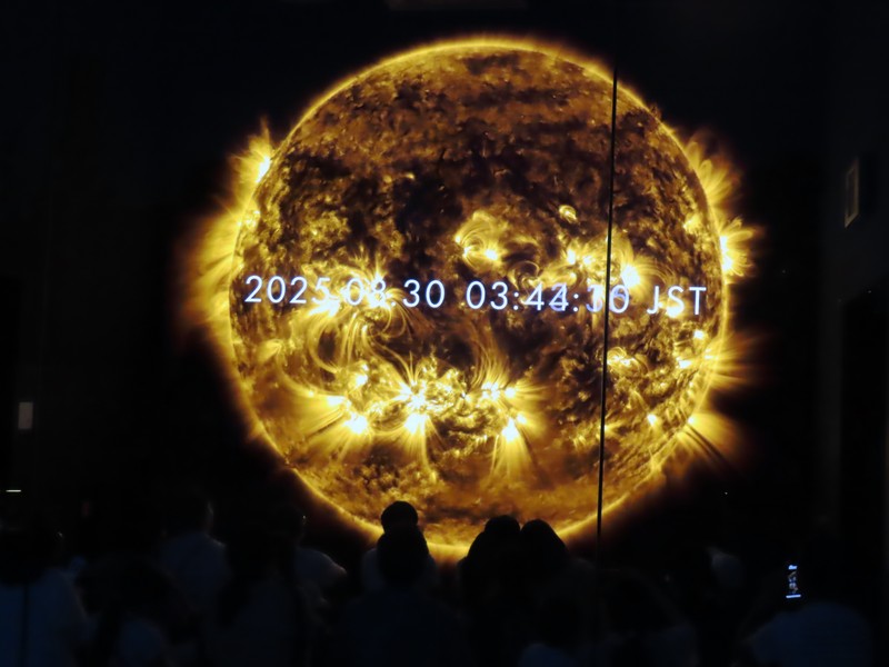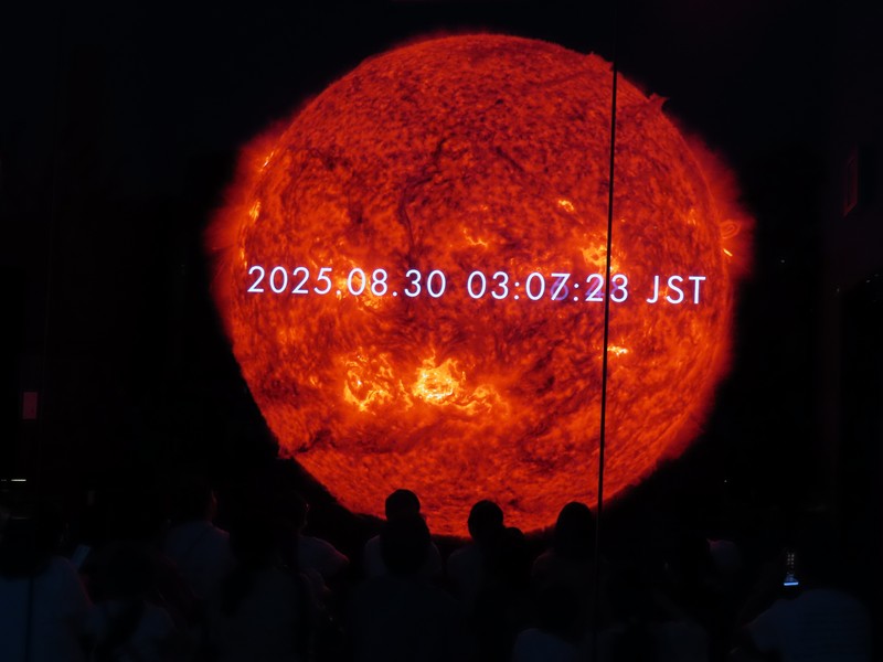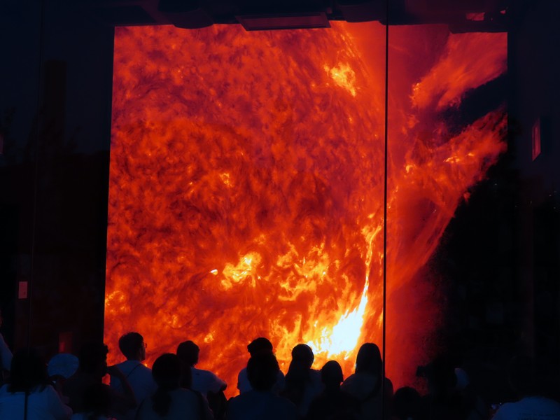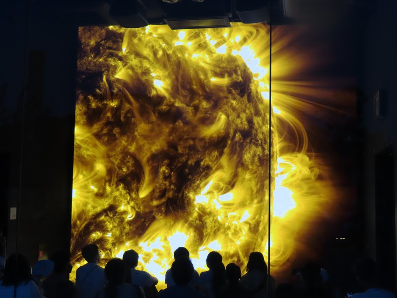 ここはしょっちゅう入場制限を行っているのでなかなか並ぶのも難しい。ただ今の時間帯は映像が外からでもはっきりと見える。アナウンスで映像の説明が入るようなものではないので、ちゃんと映像さえ見られればOK。じゃあこれでいいかと思いみてみると、ちょうど見ていない方の映像。これで十分です。 まずは「太陽の今」太陽観測衛星『SDO』が捉えた太陽の高精細画像をもとに、最新のAIと画像処理技術を用いて超高画質で映像化されたもの。色の違いは温度の違いによるもので赤い太陽は5万度の領域で、プロミネンスの動きや爆発のフレアが見える。黄色い太陽は60万度の領域で、高温のプラズマの流れを見ることができる。