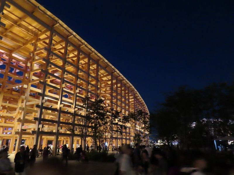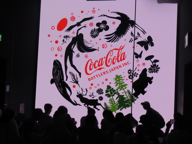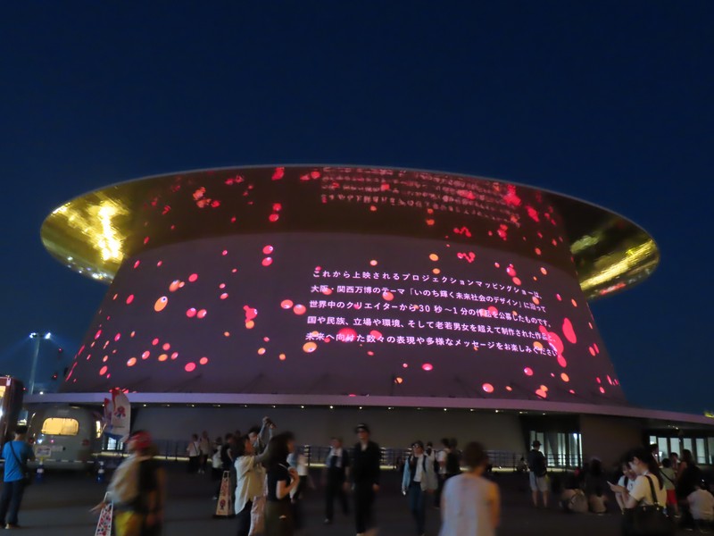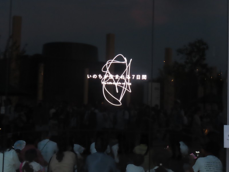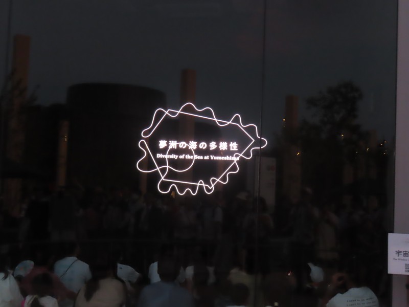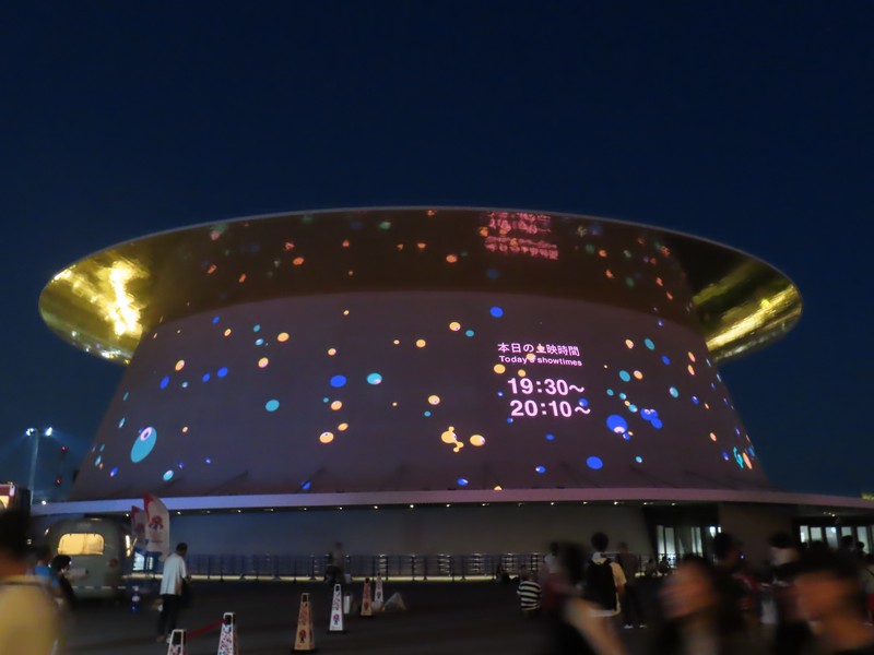 映像が終了。この前見たときは室内から出るタイミングだったし昼間だったのでそのあとのスポンサーの画面がコカ・コーラしか見えなかったが、夜に外から見るとこんなにあるのね。どれにも様々ないのちがデザインされていて、このシグネチャーパビリオンのコンセプトにも合っている。いのちをめぐる冒険、Anima!に超時空シアターに宇宙の窓2つ、これにてコンプリート。