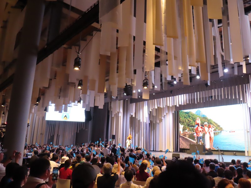 その隣はナショナルデーホール。さっき盛り上がっていたセントルシアだが、ここでも盛り上がっている。往復チケットとホテルはいったい誰の手に渡るんだろうね。そんな機会がもしあれば、何をおいても行くよね。あたる人がうらやましいです。早く帰りたいのにいろいろ気になることがあり、なかなか帰れない。シャインハットには、この後のプロジェクションマッピングの案内が出ている。これもまだちゃんと見たことはないので一度見ておかないとね。今日は帰るけど。