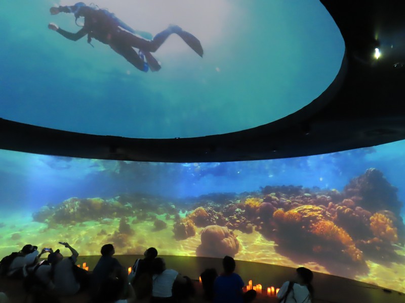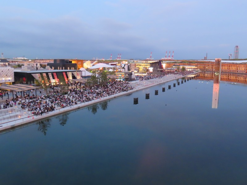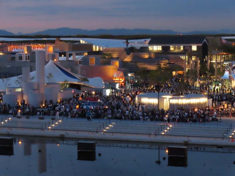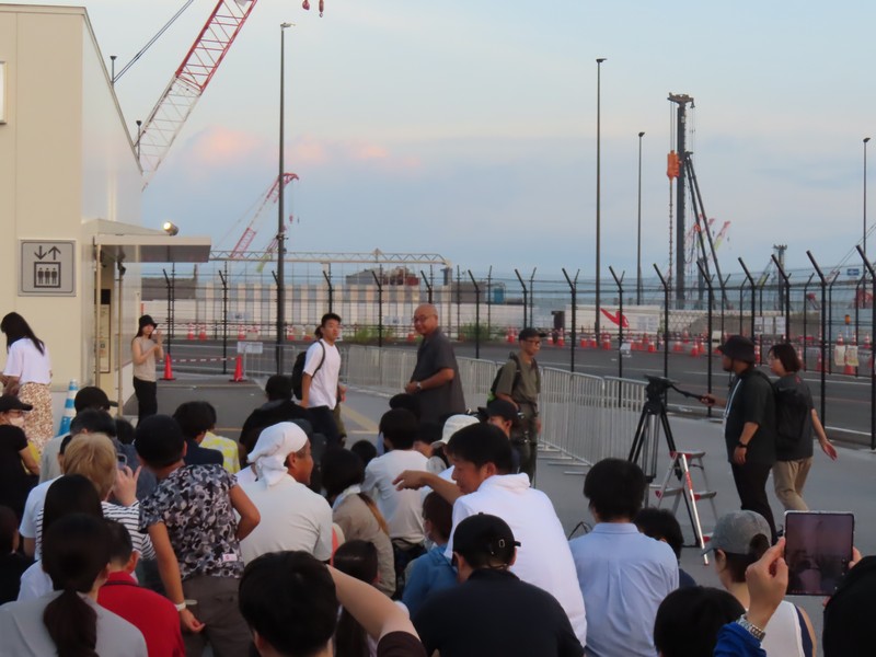 ウォータープラザまで来た。アンゴラ館前の観覧席にはたくさんの人がいるが、これはアオの予約がない人かな。かなり斜めの位置にはなるが、少しでも近くで座って見たいよね。リング上もライトアップがされていていい感じ。しばらく歩くと、ゲートの正面までやってきた。ここから見ると、中央の観覧席にはまだ人はいないがその後ろに行列ができているのが見える。8/31はあそこにいたわけで。このあとショーが行われるが、事前の動作テストが始まった。こちらからだとこんな風に見えるんだね。リング上からアオを見ようとする人もいるようで、ゲートの正面あたりには人が集まり始めているようだ。