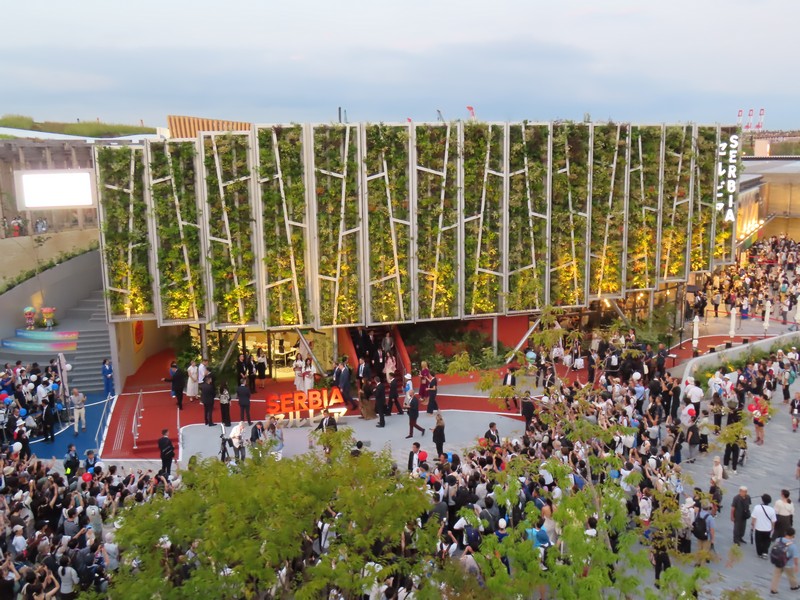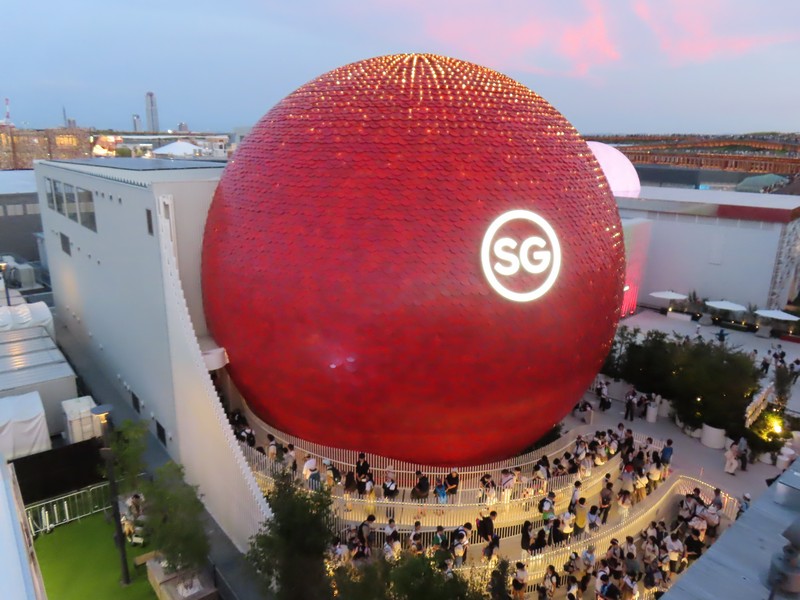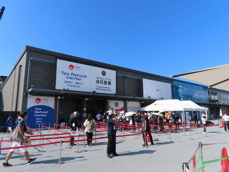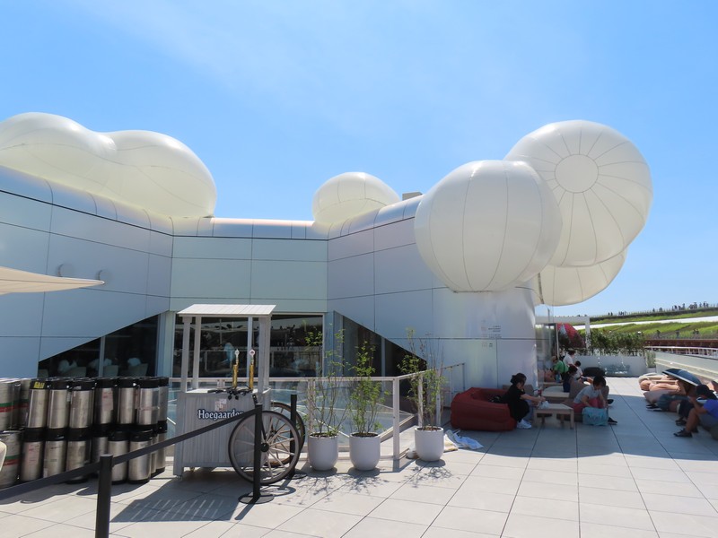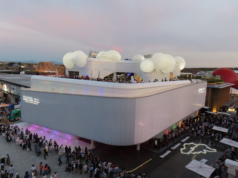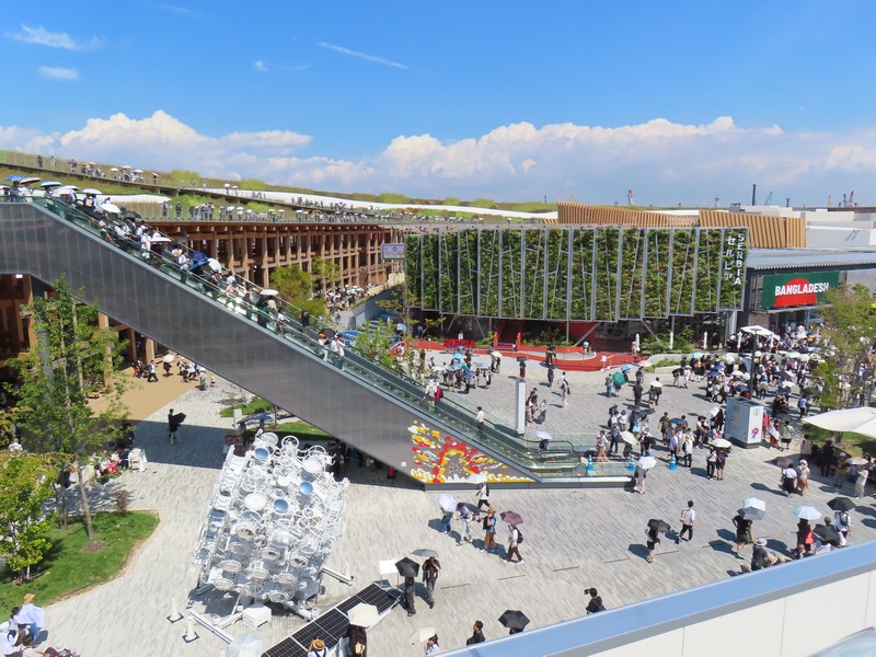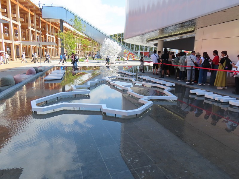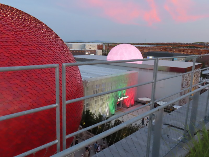 レストランを出ると、さっきとかわらず行列ができていました。並べるタイミングにちょうど来た人がならべるようだ。ここからは屋上テラスに出られる。レストランの席がここにもあるが、今の時期はちょっと暑いかな。もう少し涼しくなると気持ちいいだろうな。気体イメージの白い球、近くで見るとなかなかの大きさ。テラスからは大屋根リングがちょうど目の前に見え、セルビア館前の広場が見下ろせる。こう見るとそこまで人は多くはないが、まだまだ増えてくるんだろうな。