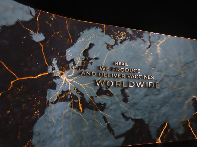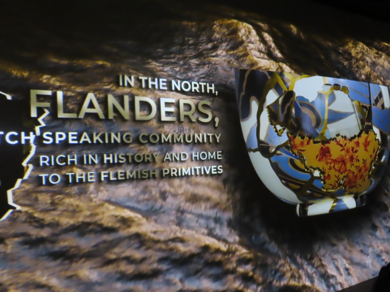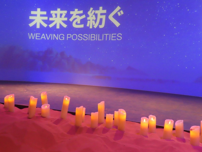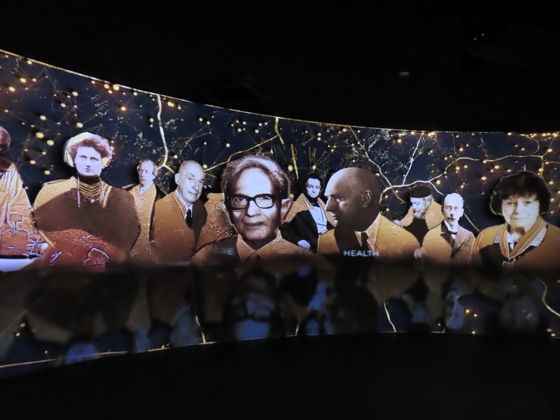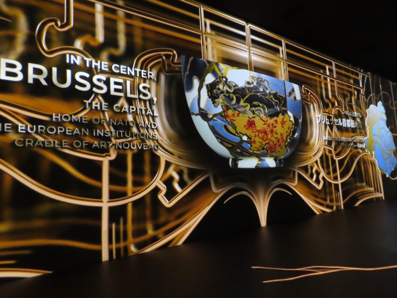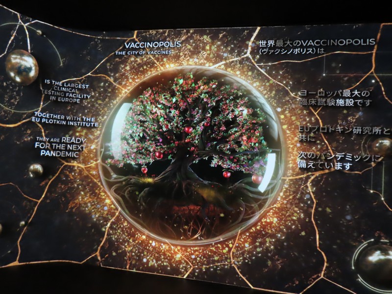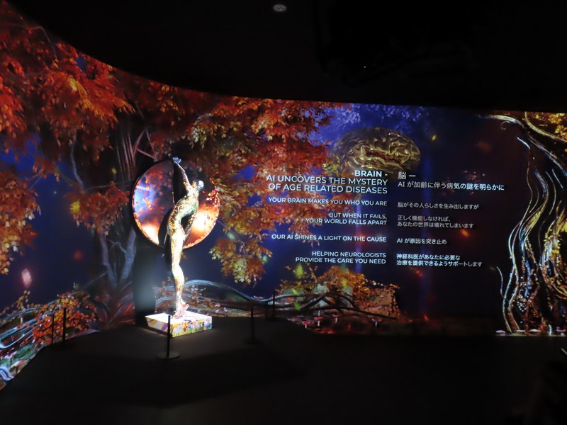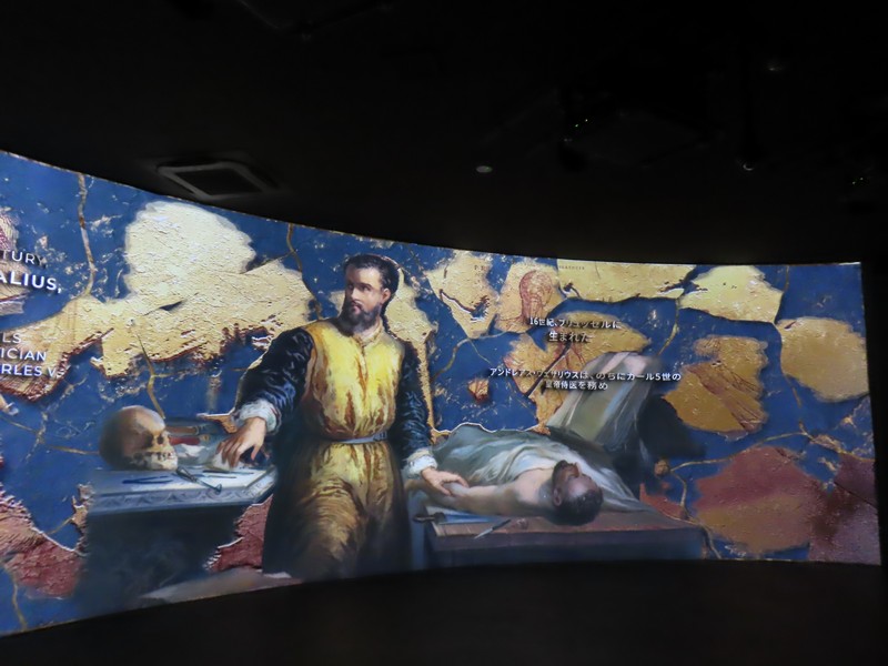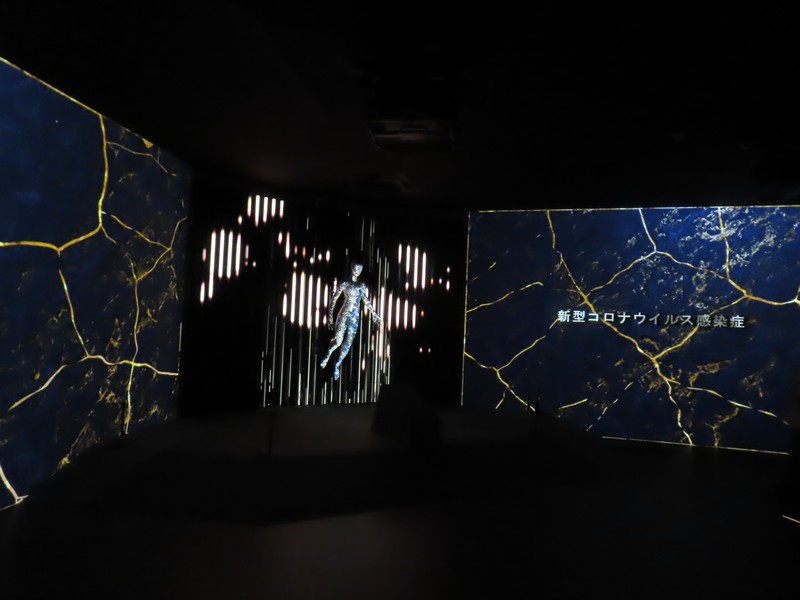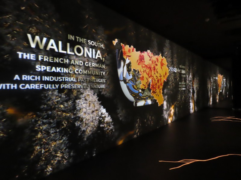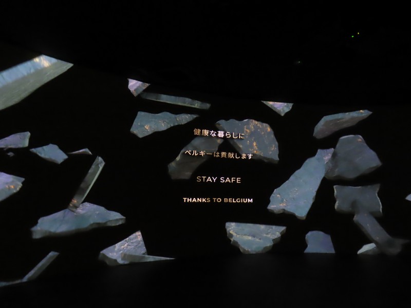 次の部屋に進むと、雰囲気は一転。緑あふれる自然から、照明を抑えたデジタル空間へ。ベルギーのヘルスケアや医療に関する内容で、新型コロナウイルスのワクチン製造についてのベルギーが果たした役割についての説明がされている。あの時もお世話になったのかな。さまざまなデータに基づく数字が紹介されているが、黒地に金色の模様は金継ぎをイメージしているらしい。壊れたものを再生するというイメージかな。16世紀の医者、アンドレアス・ヴェサリウスは近代解剖学の創始者とされ、その影響を受けたたくさんの医師がベルギーの医療発展に貢献している。そして最後に「健康な暮らしに ベルギーは貢献します」なるほど。いのち輝く未来社会のデザイン、そのコンセプトに沿った内容ですね。