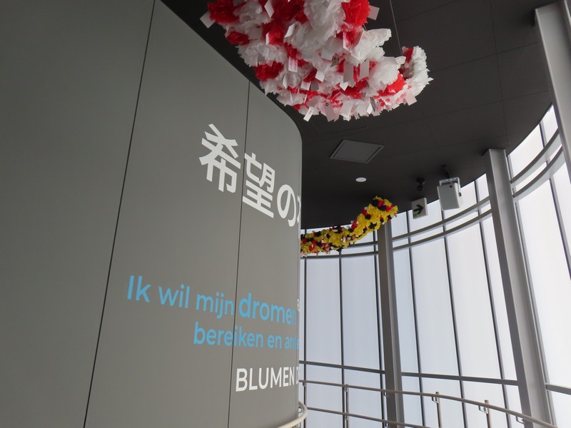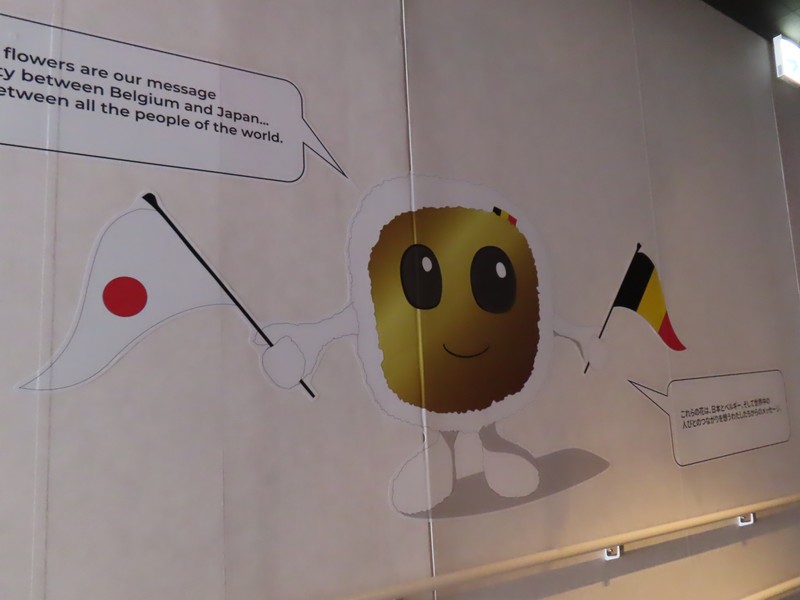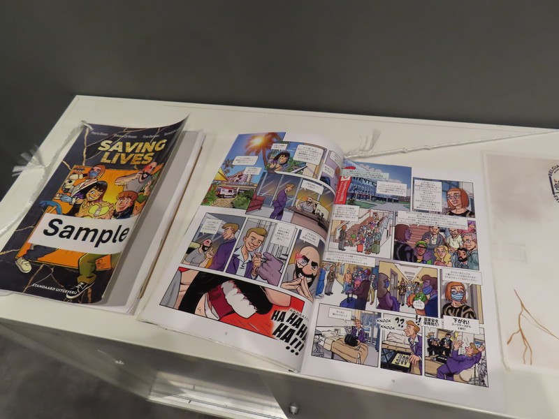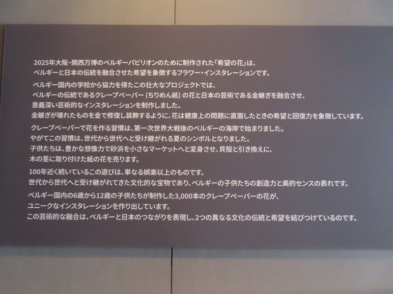 次の部屋に向かう廊下には「希望の花」が天井に展示されている。花はクレープペーパー(ちりめん紙)で作られていて、3000個以上あるとのこと。ベルギーでは古くからクレープペーパーで花を作る習慣があるようで、ベルギーの国旗色である黒、黄、赤に白を加えた色で作られている。廊下の先の部屋には写真が飾られていて、ベルギーの子供たちがこの「希望の花」を作ってくれた様子を見ることができる。ワクチンに関する漫画もあり、いろんなことを学ぶことができる。