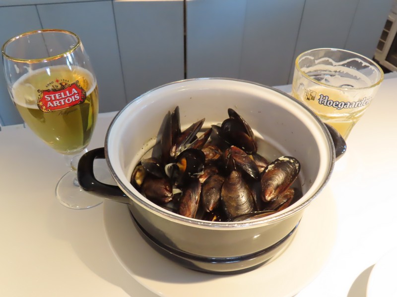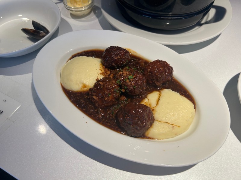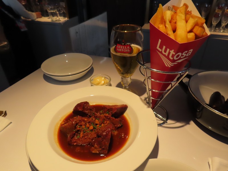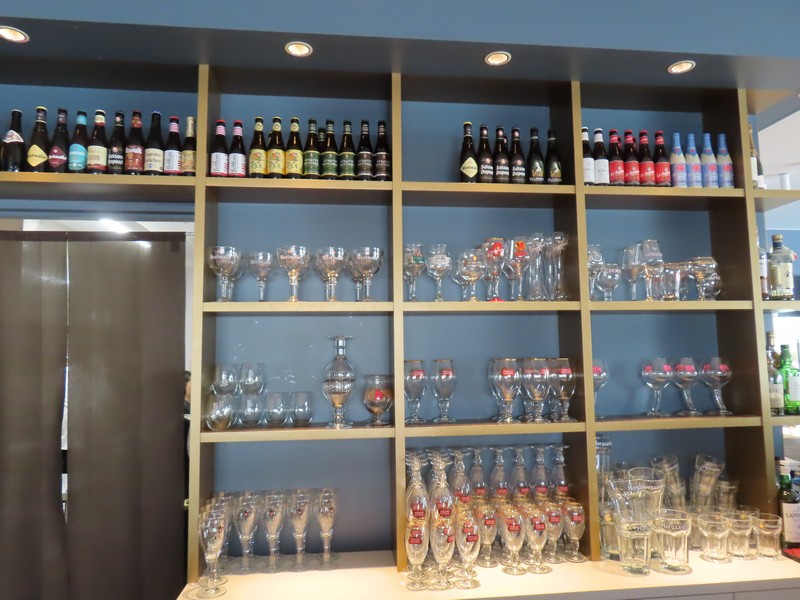 部屋を出ると、さらに階段があり上にはレストランRevive。どんなものかと見に行くと、この時間ですでにオープンしており行列ができている状態。とりあえず並んでみると、もう一組後ろに並んだところで列は一旦クローズ。あら、これはラッキーなのかな。この後来た人は、後から来るように言われていました。ならばせっかくなので並びましょう。後ろのご夫婦と話をしながら待っていると、30分ほど経った頃順番が来た。いい感じのカウンター席に案内されました。目の前にビールのボトルやグラスが並んでいる。迷いながら注文を済ませ、まずはビール。定番のステラアルトワとヒューガルテン、午前中から飲むビールは最高だ。そういえば、体調もすっかり戻っている。よかったよかった。しばらくして、ムール貝が到着。久しぶりだな。貝殻で挟みとりながらいただきます。セロリやにんにくの効いたスープにプリッとしたムール貝、ビールも進む。続いてはフランドル風ビーフシチュー。ほろほろと柔らかい牛肉と濃厚なシチューが楽しめる。ほくほくのフライドポテトも付いてきて、これをシチューと食べるのも最高だ。お得だなあ。そしてリエージュ風ミートボール、しっかりとしたお肉のミートボールで、少し酸味のあるこのソースもおいしい。濃厚なマッシュポテトもおいしいです。やっぱりベルギー料理はレベルが高くておいしいな。お店の雰囲気もいいし、これは大満足だ。ちょうどいいタイミングで入れてよかったです。
