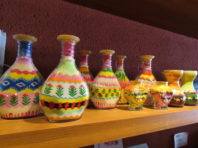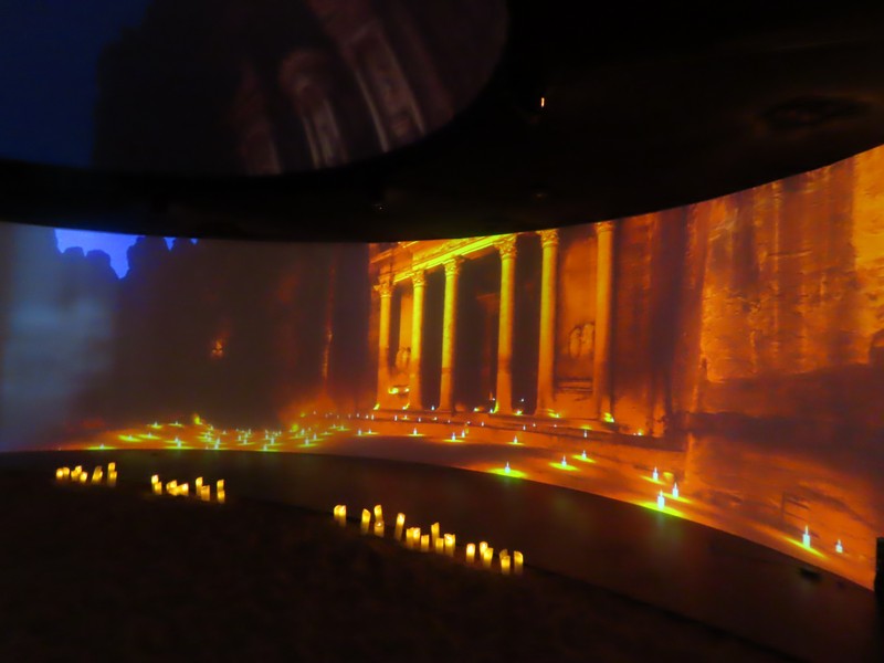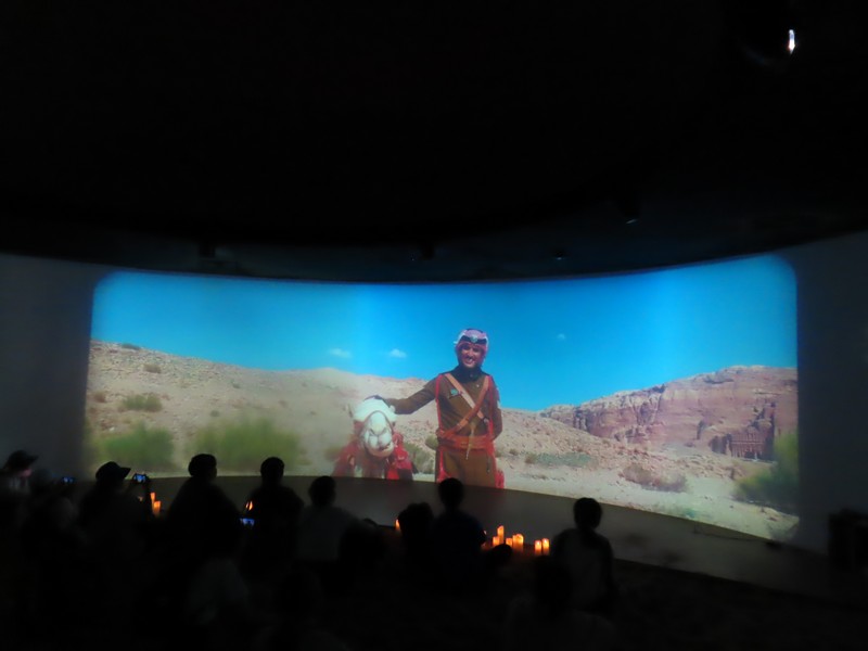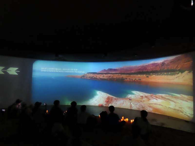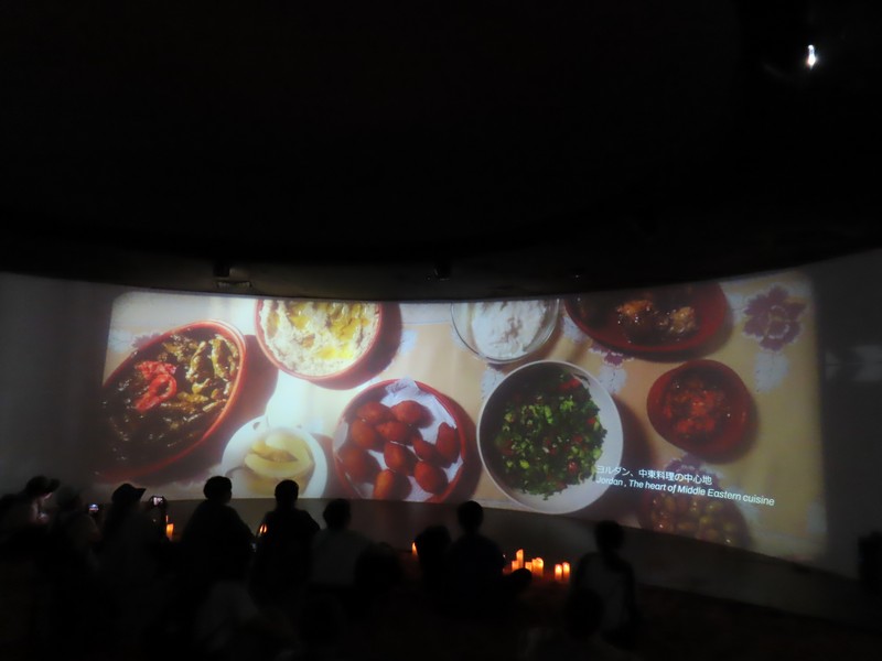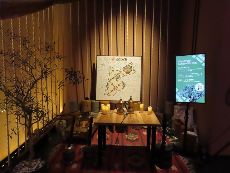 靴下を脱いで、奥の部屋に入る。やっぱりこの砂の感触が気持ちいい。大きなモニタの前にはキャンドルが置かれているが、前はなかったのでは?ペトラ遺跡の映像とキャンドル、いい感じです。今日のMCはヨルダン滞在経験のあるお姉さん、軽妙な口調でヨルダンの紹介。モニタにはヨルダンの名所や砂漠での生活風景などが映し出され、後方壁際のあたりからしっかり写真を撮ることができました。やっぱり2度目、余裕もって楽しめますね。こうしてヨルダンのことを知っていくと、ペトラ遺跡や死海など、行ってみたくなるなあ。治安もいいようだし、いつか行けるかなあ。