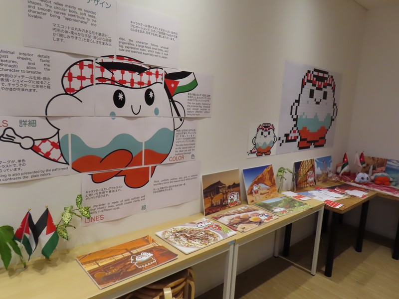 あとはショップとカフェだが、実は今日はこのヨルダンパビリオンのキャラクター。シファの作者が来ていたようで、2階にその展示があるとのこと。せっかくなので見ていきましょう。2階に行くと、マッサージ部屋があってちょうど3名並んでマッサージ中。これもよさそうだな。展示室は今は誰もいないがシファのキャラ紹介やヨルダンについての説明などが展示されている。ヨルダンの国旗を持ったシファ君、目が国旗の星と同じなんだね。ヨルダンのデザイナーによる作品だが、なんとなく日本でのデザインのようにも見える。かわいいな。2度目のヨルダン、あとはショップを見て終了。堪能しました。