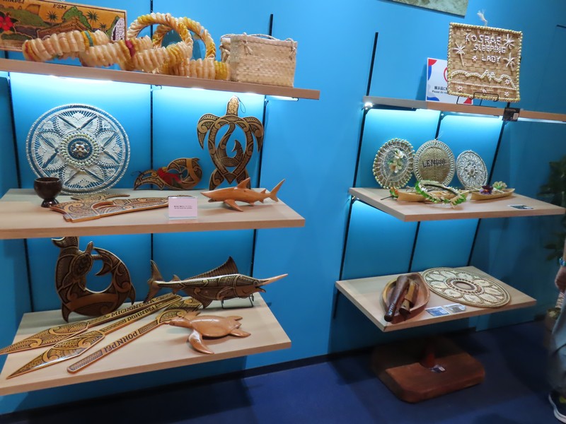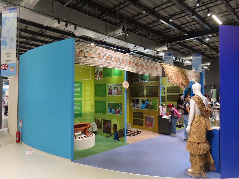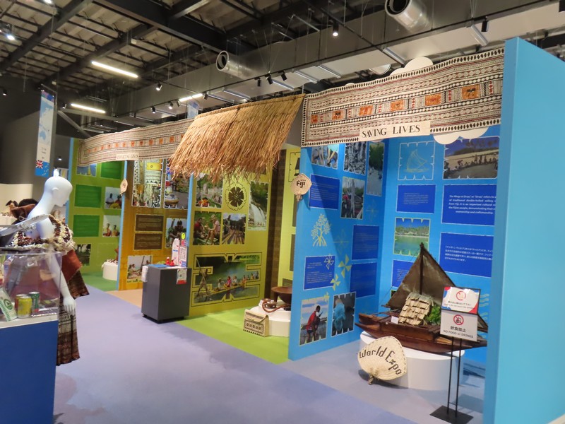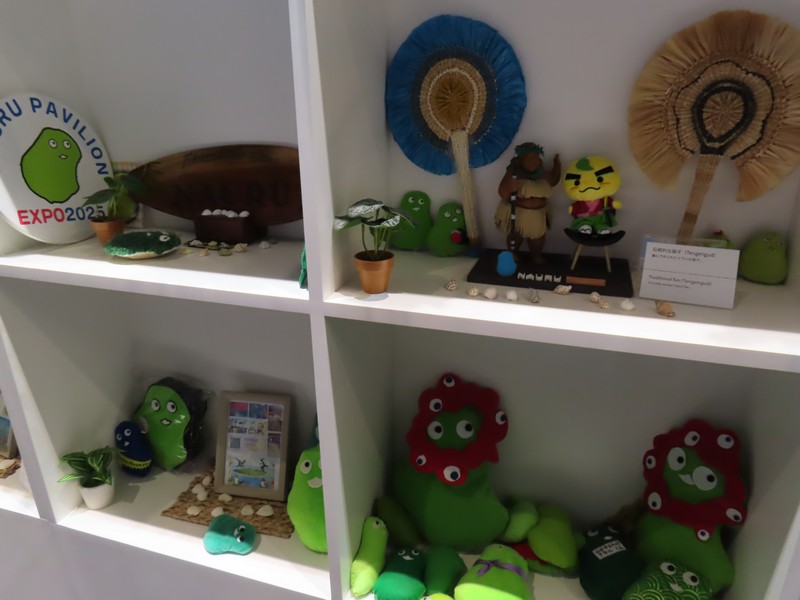 太平洋の島国・首都はヤレンということになっているが公式な首都が存在しないとのこと。そんなことある?バチカン、モナコに続く世界で3番目に小さな国。ここはなんとも毒時で、島の形をもとにしたナウルくんというキャラの全面推し。来場者の手作りや、ミャクミャクとのコラボなどであふれかえっているがそんな中に伝統的な扇子だったりヤシの葉のかごだったりという展示もある。棚の上にあるのはナウルの言葉なのかな。手作り感満載のパビリオン、そういえばUSJからの船にもナウルくんがたくさんいたし、独自の広がりを見せている。いやあ、こういうのもおもしろい。