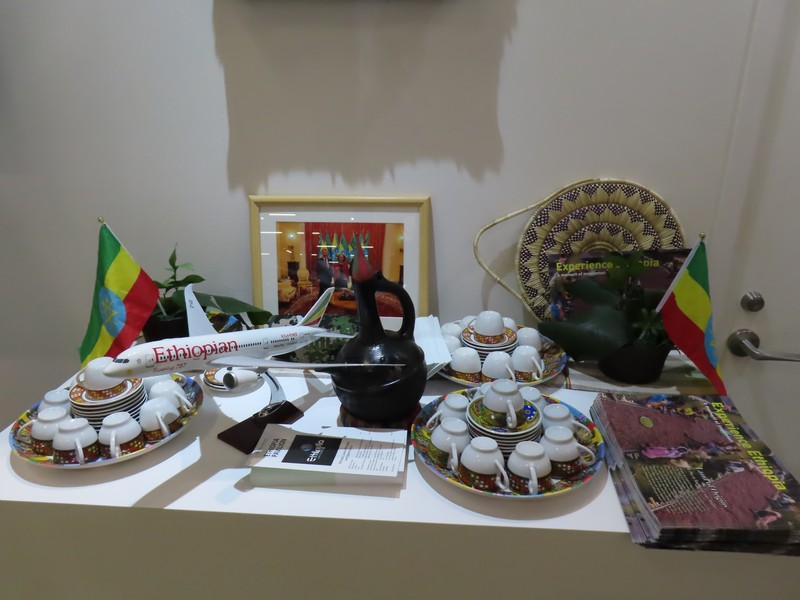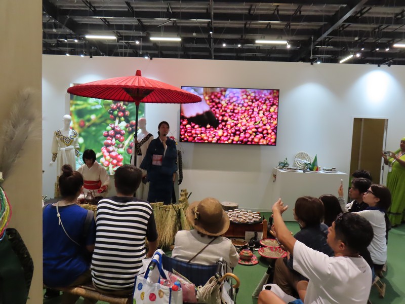 東部アフリカ・首都アジスアベバ。ちょうどこのタイミングで、抹茶とコーヒーのお茶会が行われていました。コーヒー豆の写真の前に和傘に着物というミスマッチ、これも万博ならでは。ここは今は入れないのあとから再訪。コーヒーの茶器セットが展示されていました。あとエチオピア航空、今は成田発ソウル経由でアジスアベバへのフライトあるそうで、ソウル行きに使う人もいるそうです。なるほど。