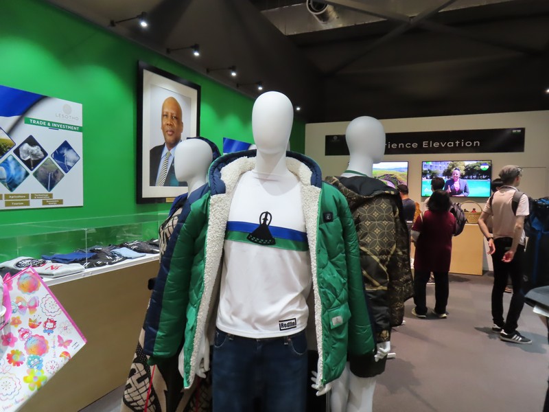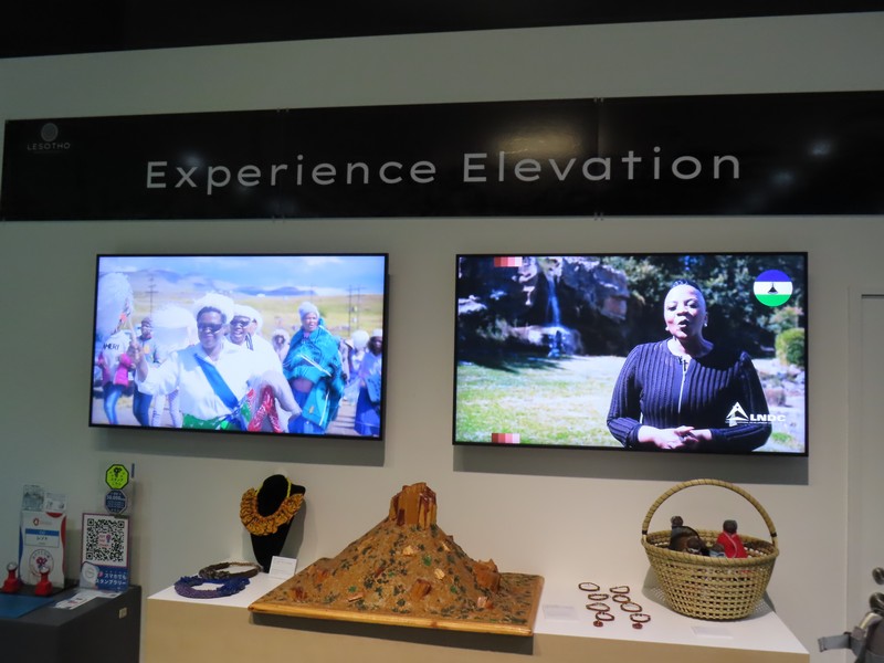 南部アフリカ・首都ナセル。南アフリカ共和国に囲まれた国だ。全体的に標高が高く、気候も過ごしやすいため「アフリカのスイス」とも呼ばれているらしい。そのせいか、マネキンが来ているのは暖かそうな上着。国内にハイキングコースが整備されていたりと、新たな発見ですね。奥にはモニタがあって冬には雪が降り、スキーができることも紹介されているが、その前にあるまるで味噌のような山はキロアン山というレソトでは神聖な山。そしてその山を模しているのがレソトの国旗にも描かれているバソトハットという帽子。アクセサリーの展示もあったが、この帽子の形もあり。かわいいよね。