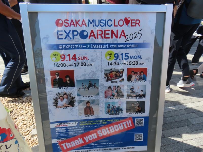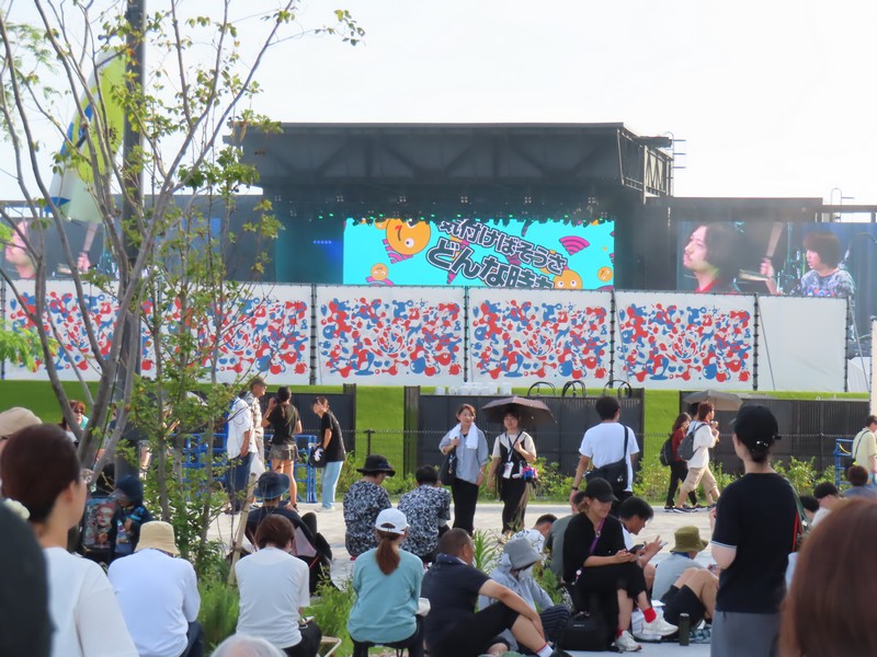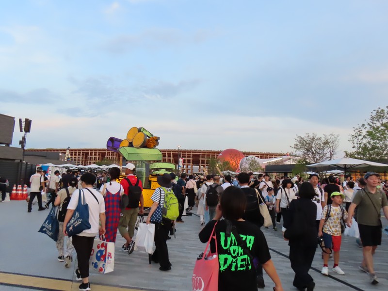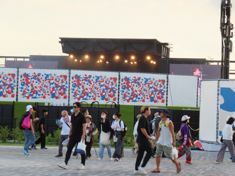 さっきくじに並んでいたときから気づいていたが、アリーナMatsuriでライブが始まっている。今日は6組出るらしく、さっきはHump Backというガールズバンドが聞こえていた。今聞こえているのはキュウソネコカミ、少しだけステージのモニタが見えているし音も聞こえてくる。その音漏れで盛り上がっているファンの姿もちらほらと見えている。途中のMCも聞こえてきたが、万博でライブができることを名誉に思えるバンドっていいな。頑張ってほしいものです。30分くらいで終了し、次は04 Limited Sazabys。あまり知らないが、こちらも盛り上がっていました。この後気志團、緑黄色社会、スキマスイッチと続き終了予定は20:00。うーん、緑黄色社会とか聞いていみたがさすがにちょっと遅いなあ。暗くなる前に大屋根リングも歩きたいので、行きますか。