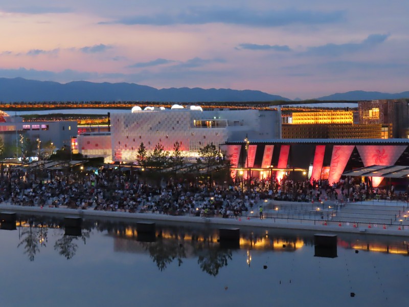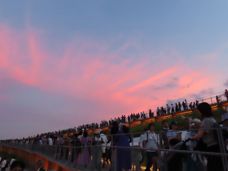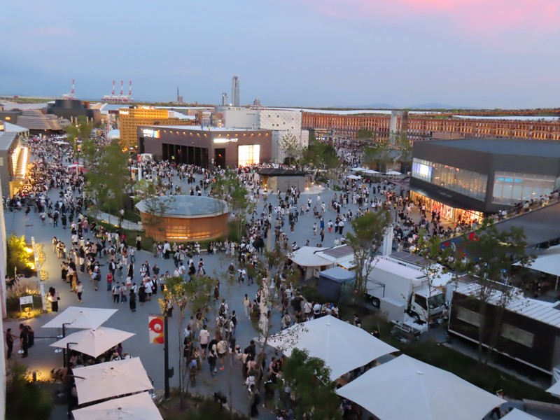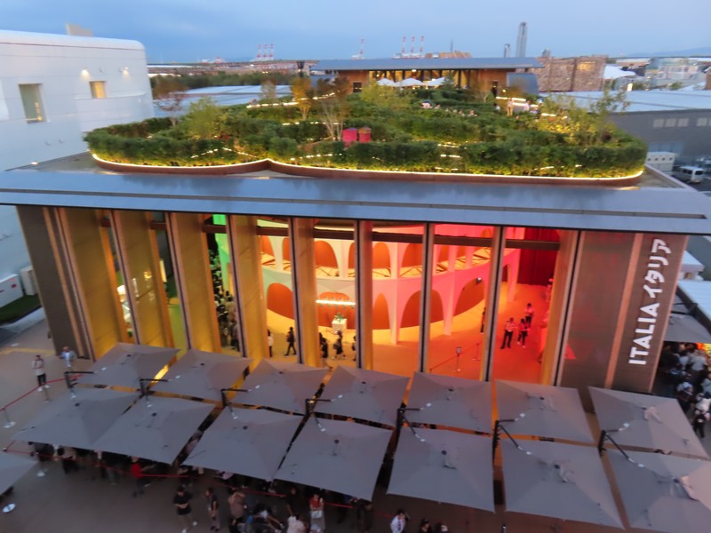 西ゲートを越え、大屋根リングへ。また人の多いエリアに戻ってきた。リングへのエスカレーターに乗るにも長い行列になっている。エスカレーターから見るセルビア館、今日はナショナルデーなのでパビリオンは閉館しているが、ちょうど館内から偉い人が出てきたようで人が集まっている。あとで調べると、なんとアレクサンダル・ヴチッチ大統領が来日されていたとのこと。この写真でSERBIAのAの右側の人がおそらく大統領なのかな。さあ、大屋根リングを散策しますか。日が沈み始め、空が赤く染まっている中に灯りが付き始めたパビリオン、きれいだな。特にイタリア館は中のコロッセオのようなところがライトアップされていてとてもきれい。それにしても、夕日を見ているのかリング上部には人でいっぱいだ。