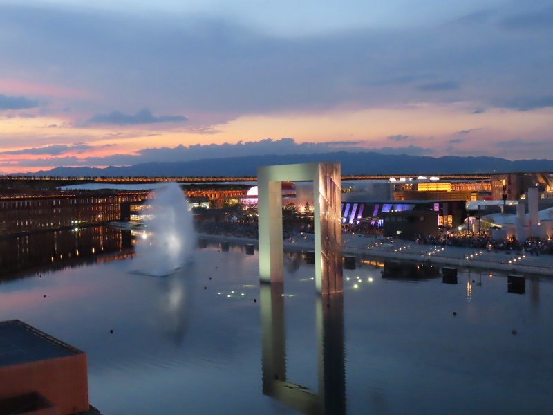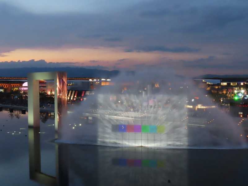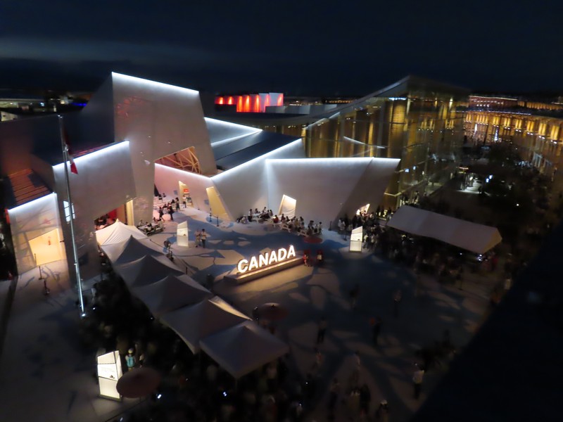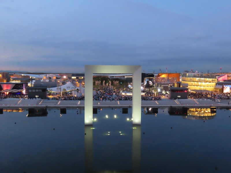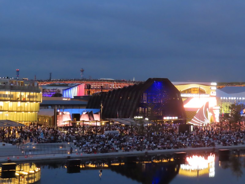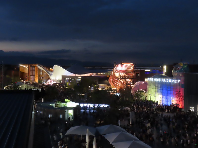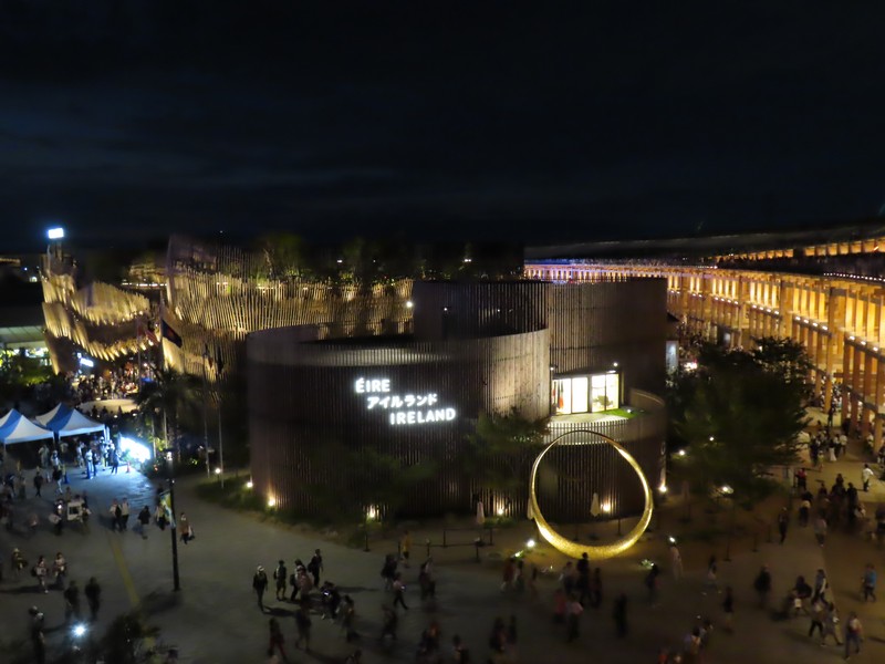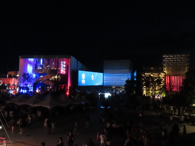 リングに上がってから30分ほど経ち、もうすっかり暗くなった。コロンビア館も3色にライトアップするんだね。その向こうのオーストリア館、クウェート館、中国館なども明るくてきれいだな。でもやっぱり一番明るいのはトルクメニスタン、よく目立つ。ポルトガル館、カナダ館、UAE館などそれぞれ昼間とは違う表情を見せている。アイルランド館はシンボルの金の輪っかが光ってきれいだな。ここでエスカレーターを下りる。フランス館やアメリカ館といった、夜でも比較的見慣れたパビリオンではあるが見るとやっぱり写真を撮ってしまいます。このあと花火やドローンもあるが、今日はこれで帰りましょう。
