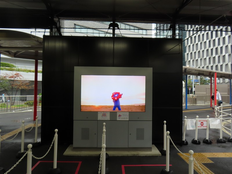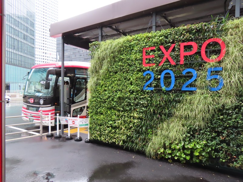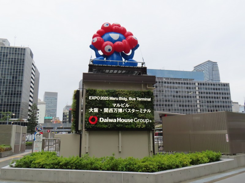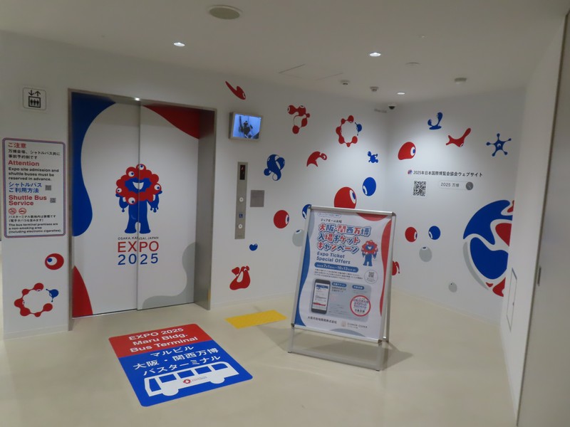 大阪・関西万博、29度目の訪問、単独入場、その後待ち合わせ。2日前予約にてゲットした11時入場だ。ここまで2日前予約は4連勝、エラーもありつつ何とか取れている。この時間ならばバスで行く方法もあるので調べてみると、ずっと満席だった朝の便が前日夜には空いていたので大阪駅8:20発をゲット。丸ビル跡地にあるバスターミナル、ミャクミャク像があるのはよく見ていたが、ここから乗るのは初めてだ。8時過ぎにバスターミナルに到着、エレベーターもミャクミャクカラーが満載だ。バス乗り場の前にはモニタがあり、万博の紹介ビデオが流されている。何種類か流れるが、やっぱりこの、何もない更地の夢洲でミャクミャクが踊るバージョン。これはちょうど3年前の10/12らしく、本当に何もない。まだ万博の機運もない時期に、まるで3年後の盛り上がりを確信しているようで、改めて素晴らしいです。バスが到着、ほぼ満席だが予約制なので確実に座れる。少し小雨の降る中、出発だ。